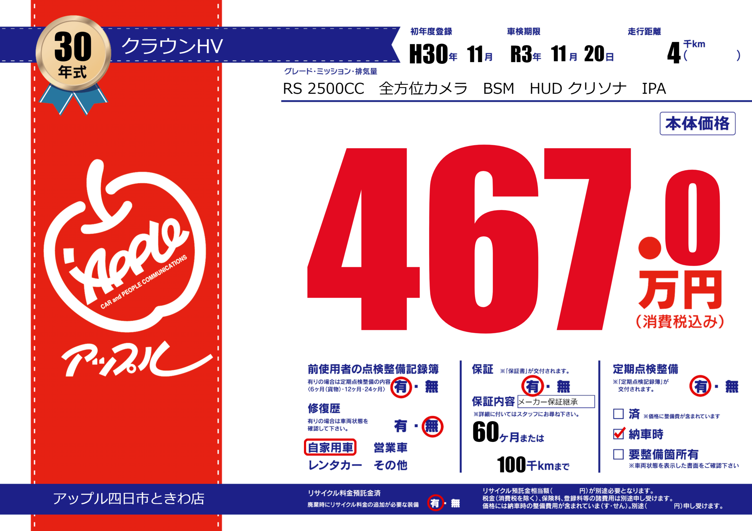 | 車名 | クラウンHV | グレード ミッション 排気量 |