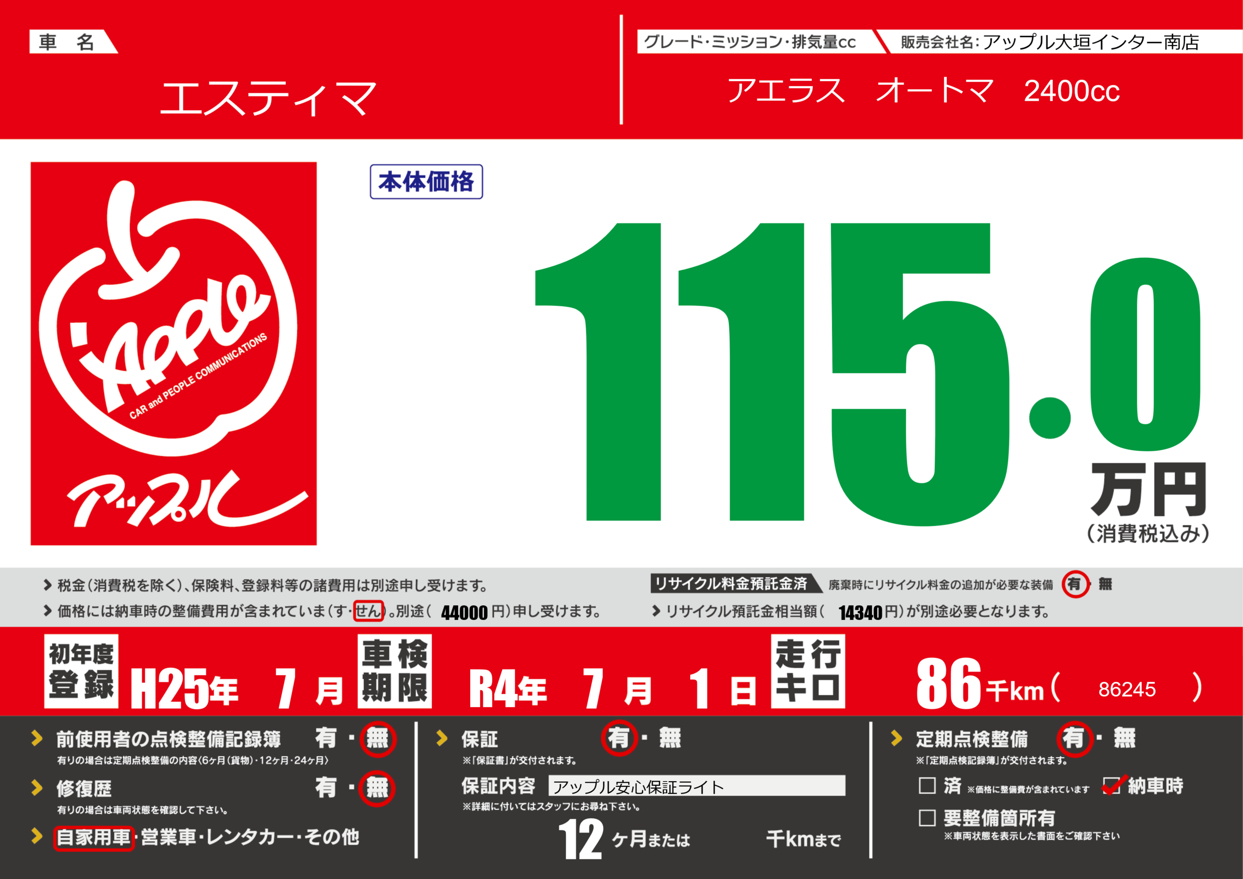 保証付き 保証内容(アップル安心保証ライト) 12ヶ月または()千kmまで |