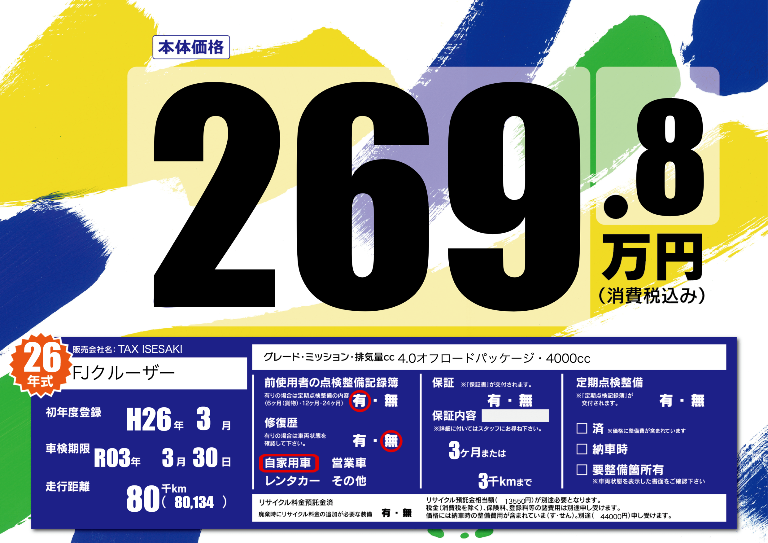 | 走行キロ | 8万km | 初年度登録 | H26年3月 |