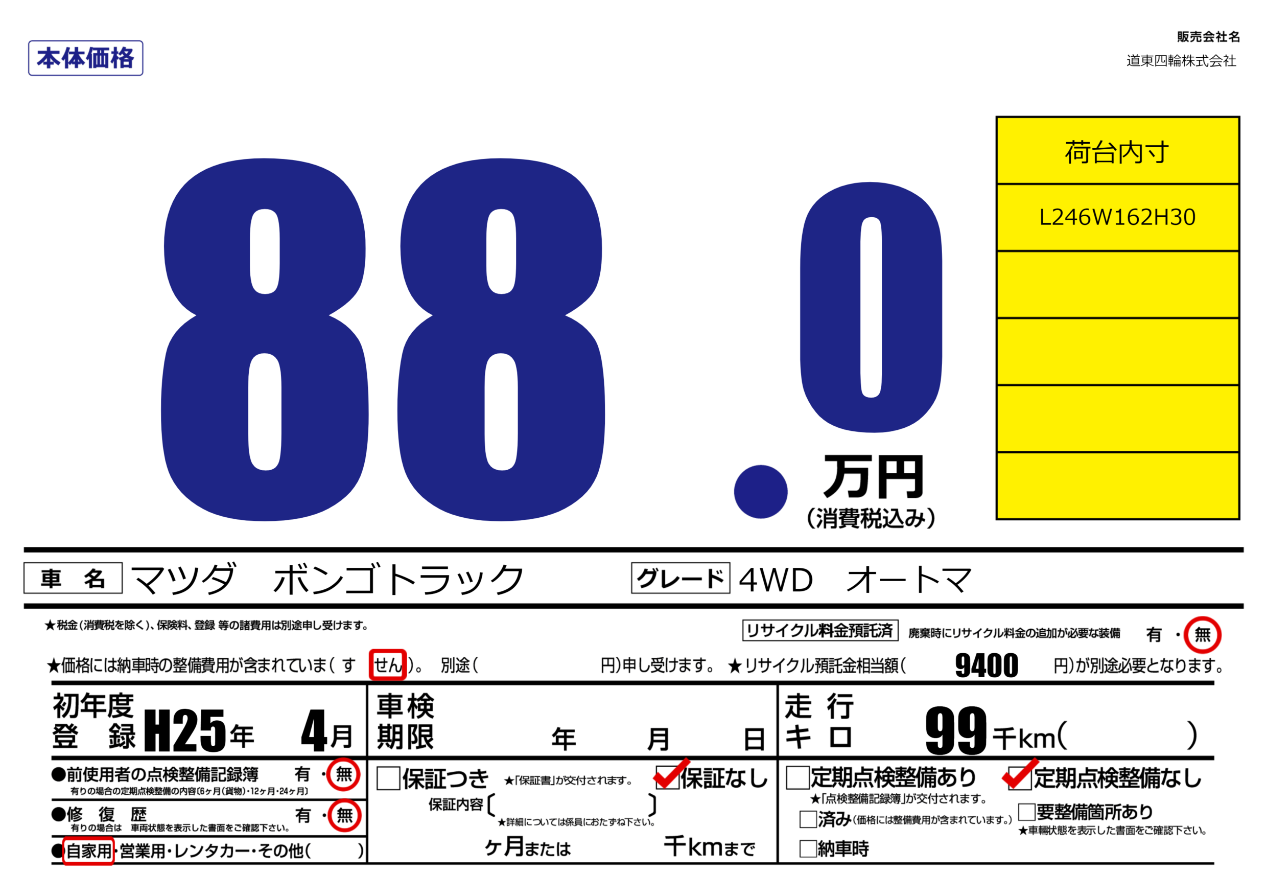 | 車名 | マツダ ボンゴトラック | グレード ミッション 排気量 |