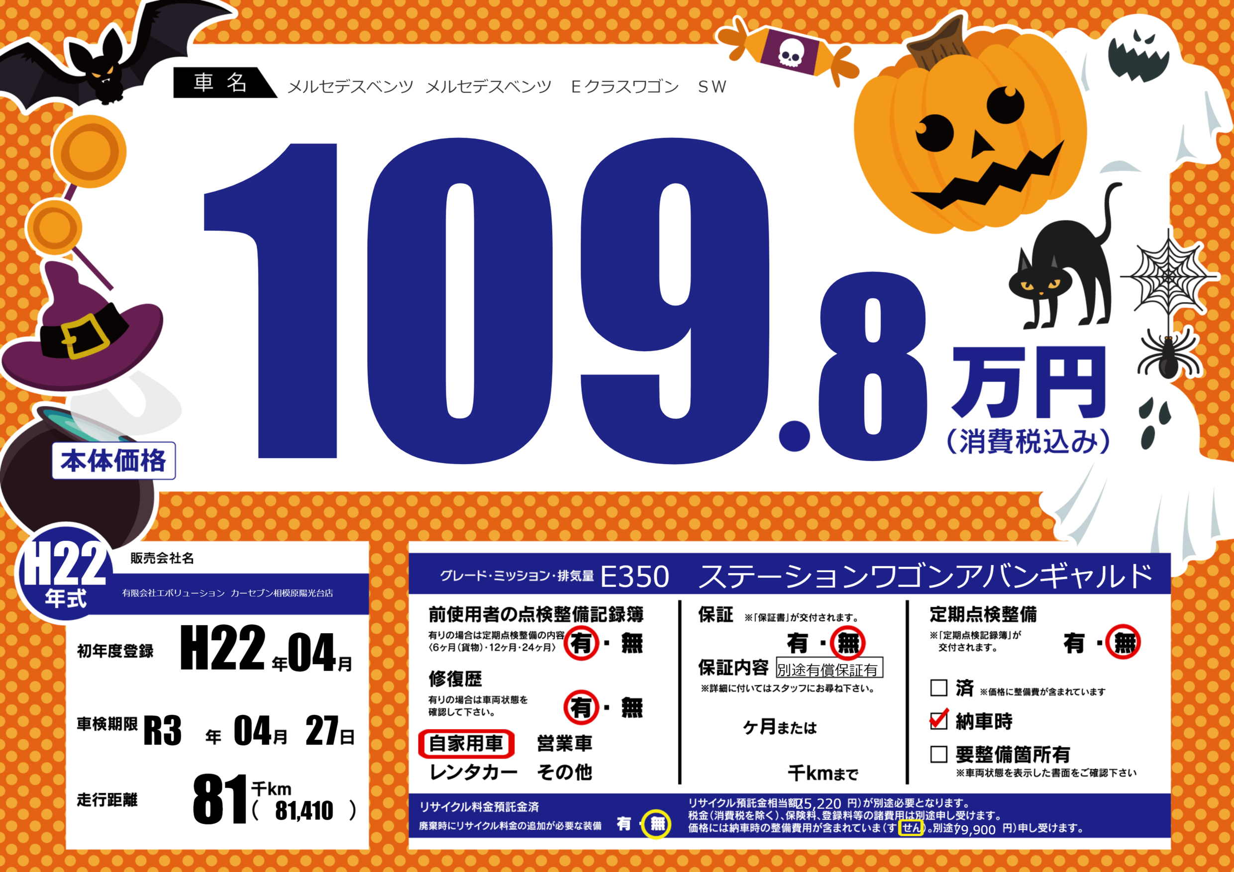 | 車名 | メルセデスベンツ メルセデスベンツ Eクラスワゴン SW | グレード ミッション 排気量 |