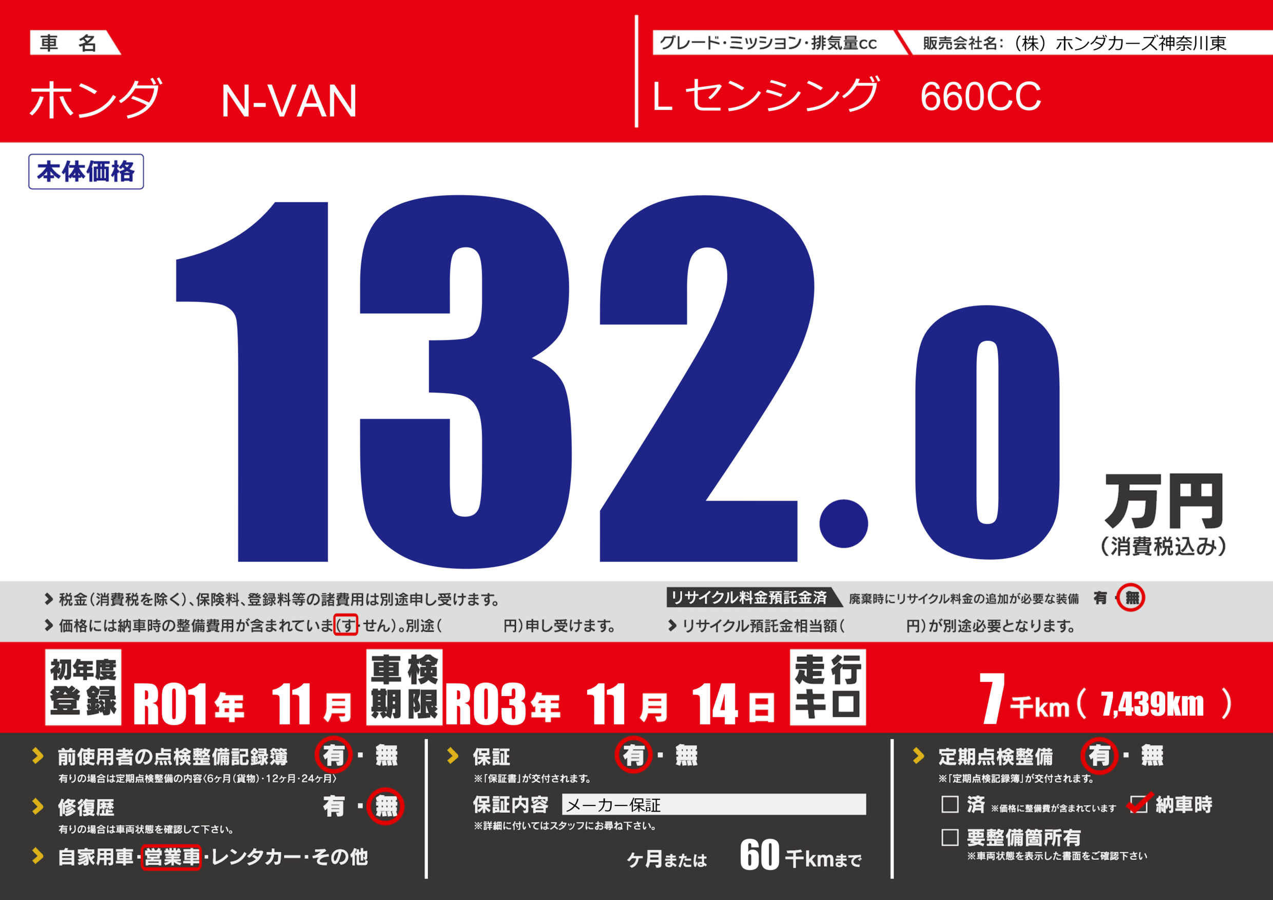 | 車名 | ホンダ N-VAN | グレード ミッション 排気量 |