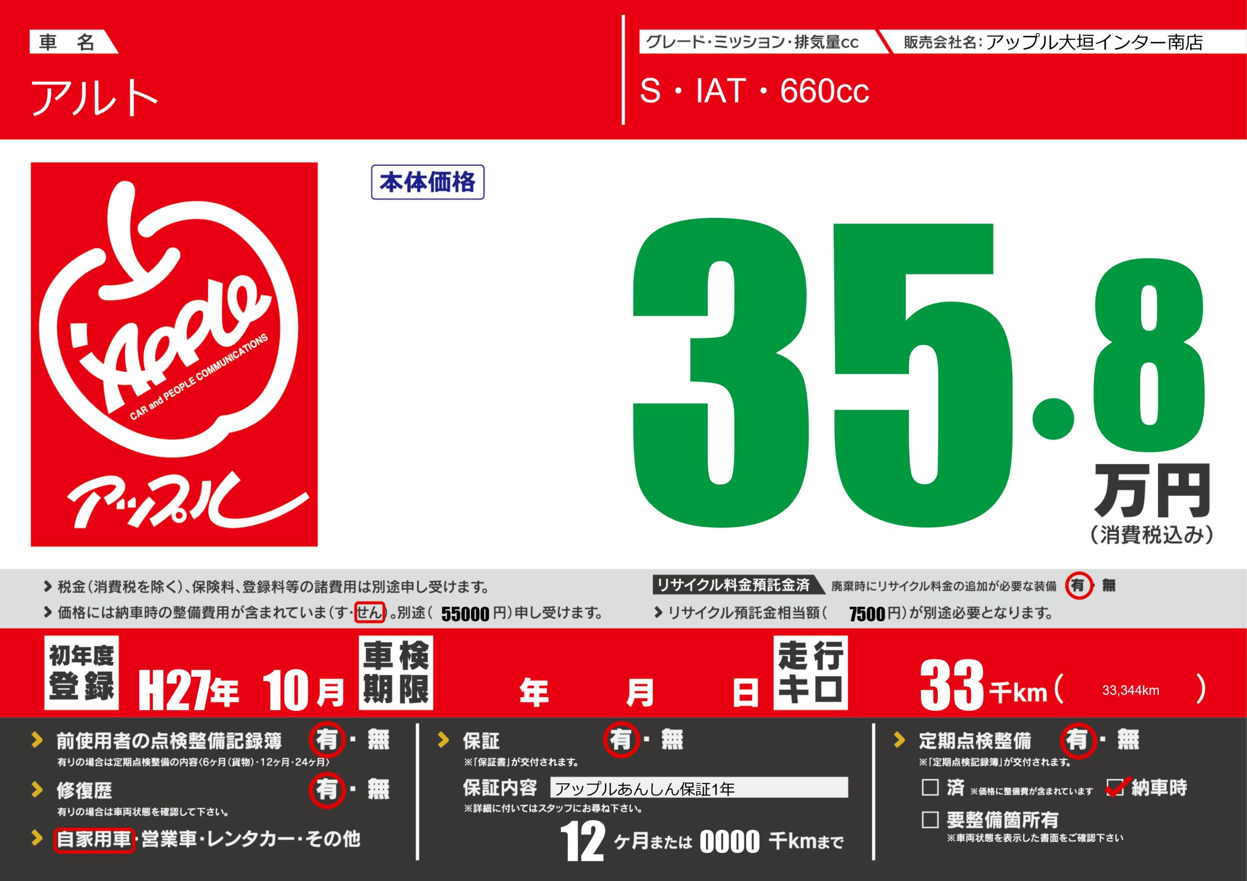保証付き 保証内容(アップルあんしん保証1年) 12ヶ月または(0000)千kmまで |