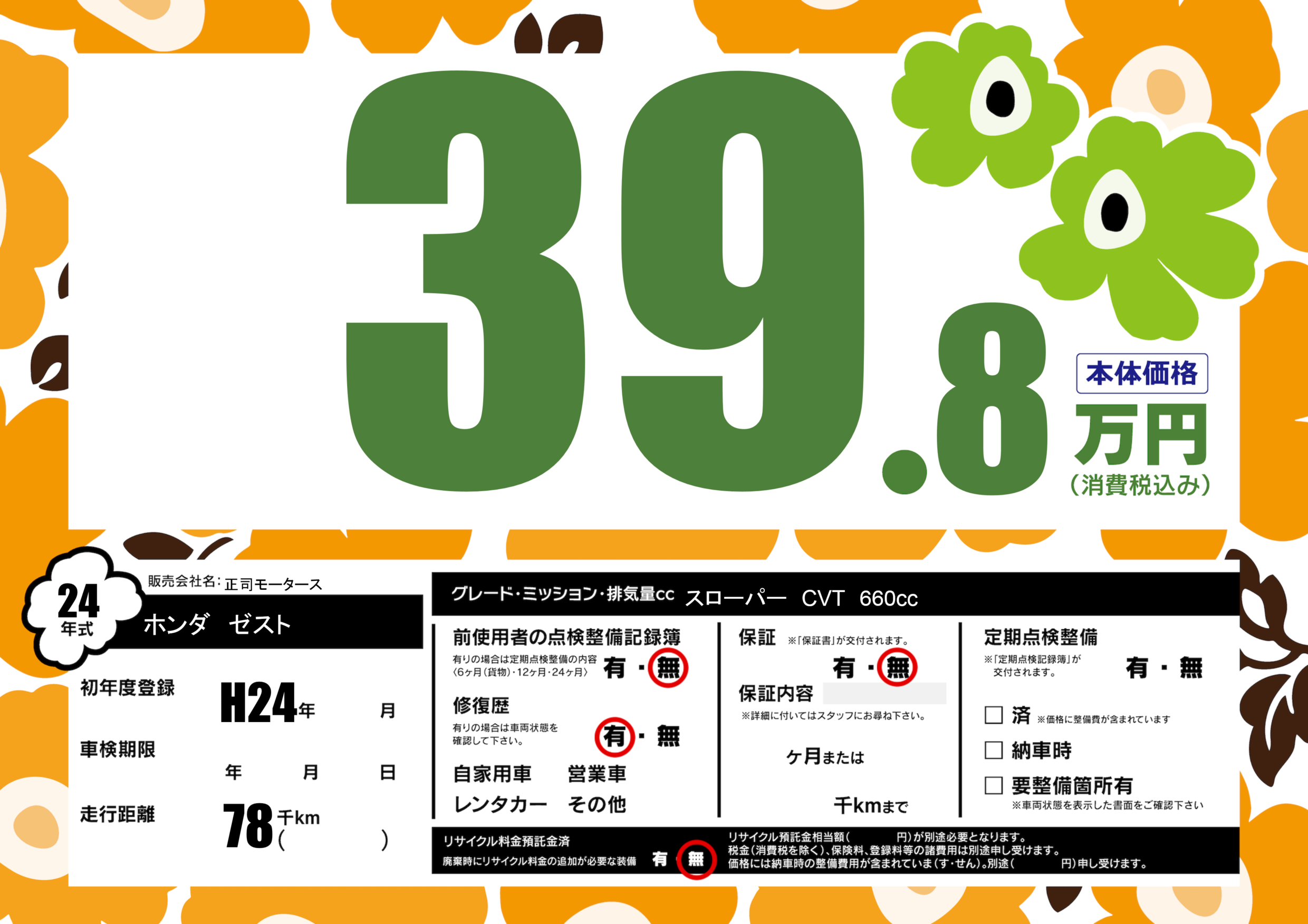 | 車名 | ホンダ ゼスト | グレード ミッション 排気量 |