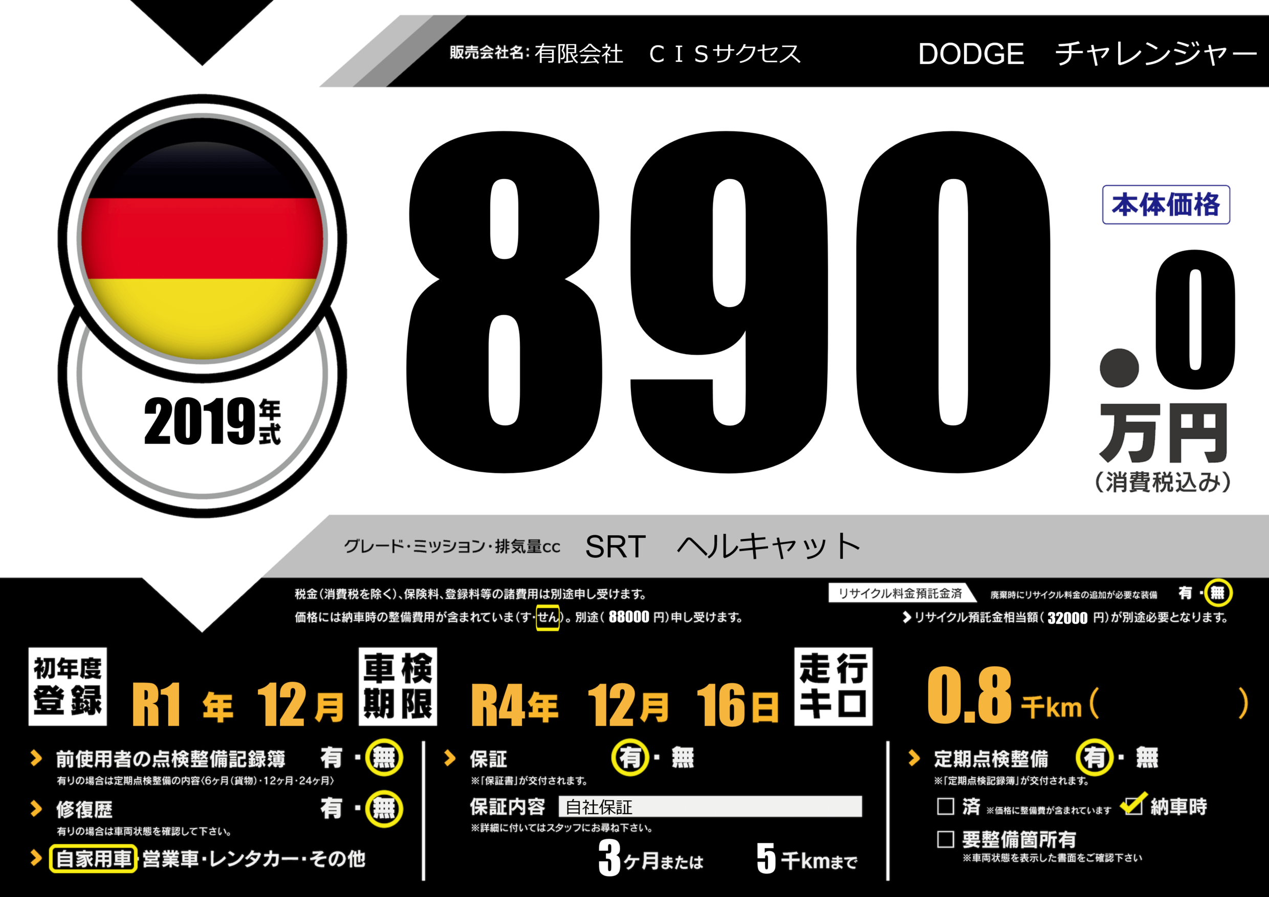 | 車名 | DODGE チャレンジャー | グレード ミッション 排気量 |