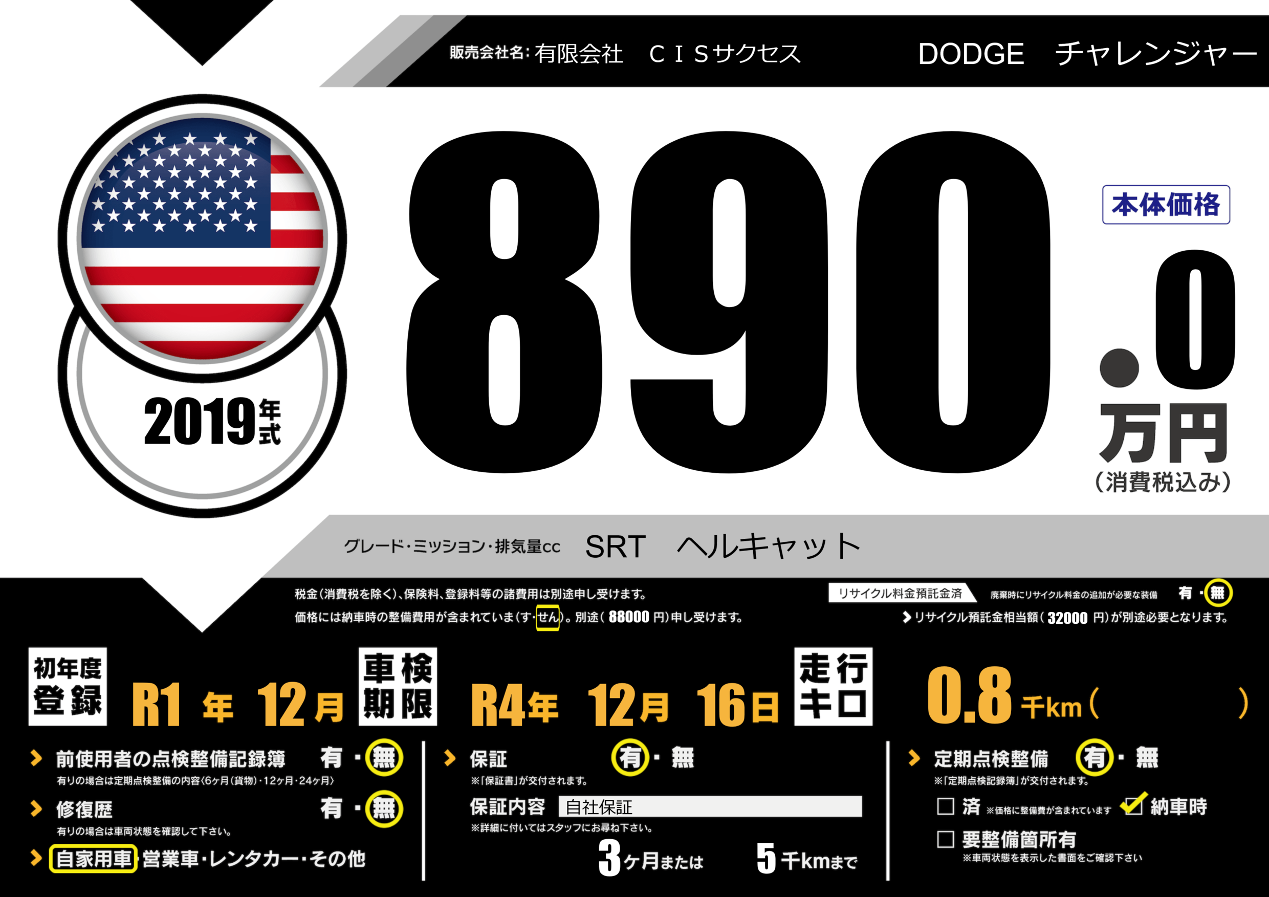 | 車名 | DODGE チャレンジャー | グレード ミッション 排気量 |