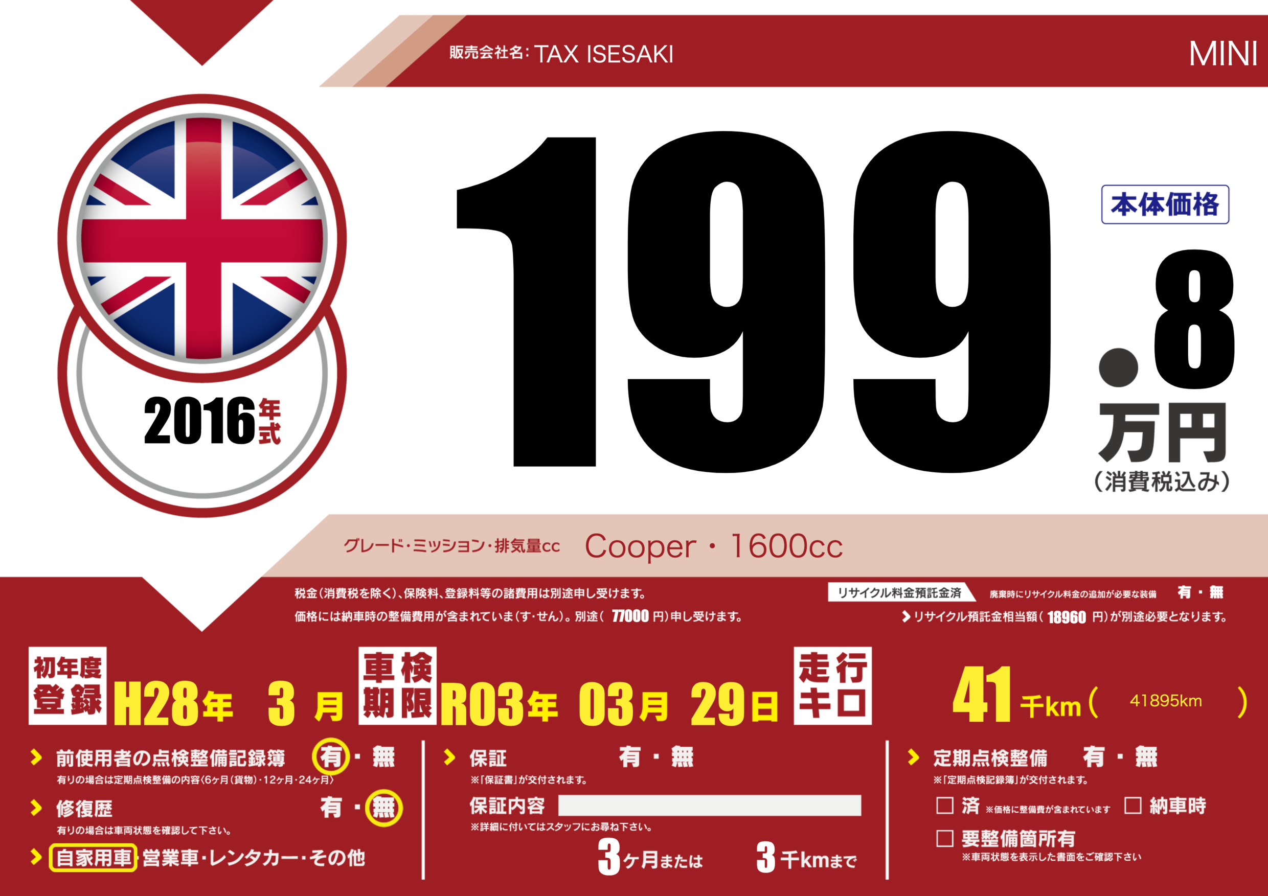 | 走行キロ | 4.1万km | 初年度登録 | H28年3月 |