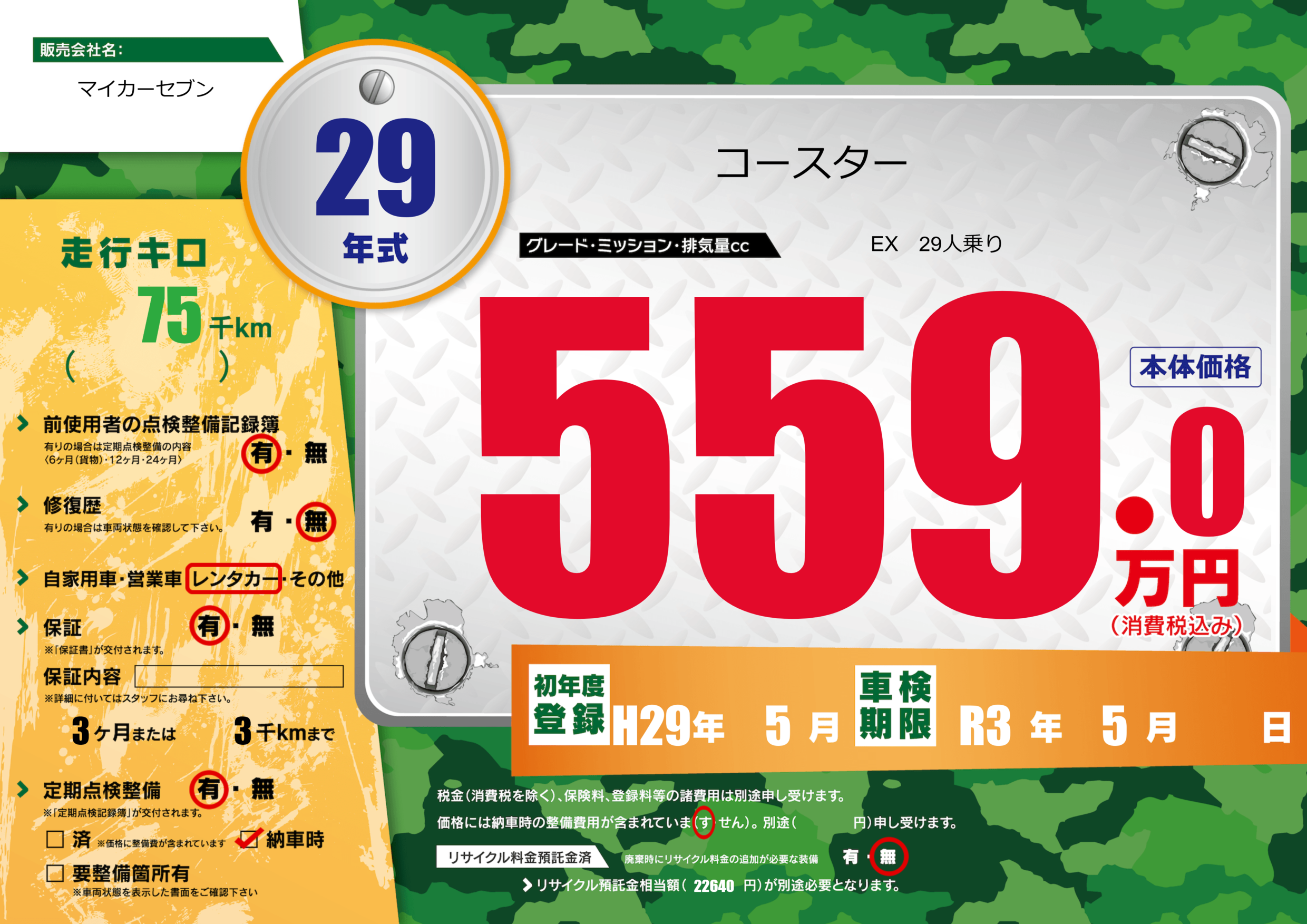 | 走行キロ | 7.5万km | 初年度登録 | H29年5月 |