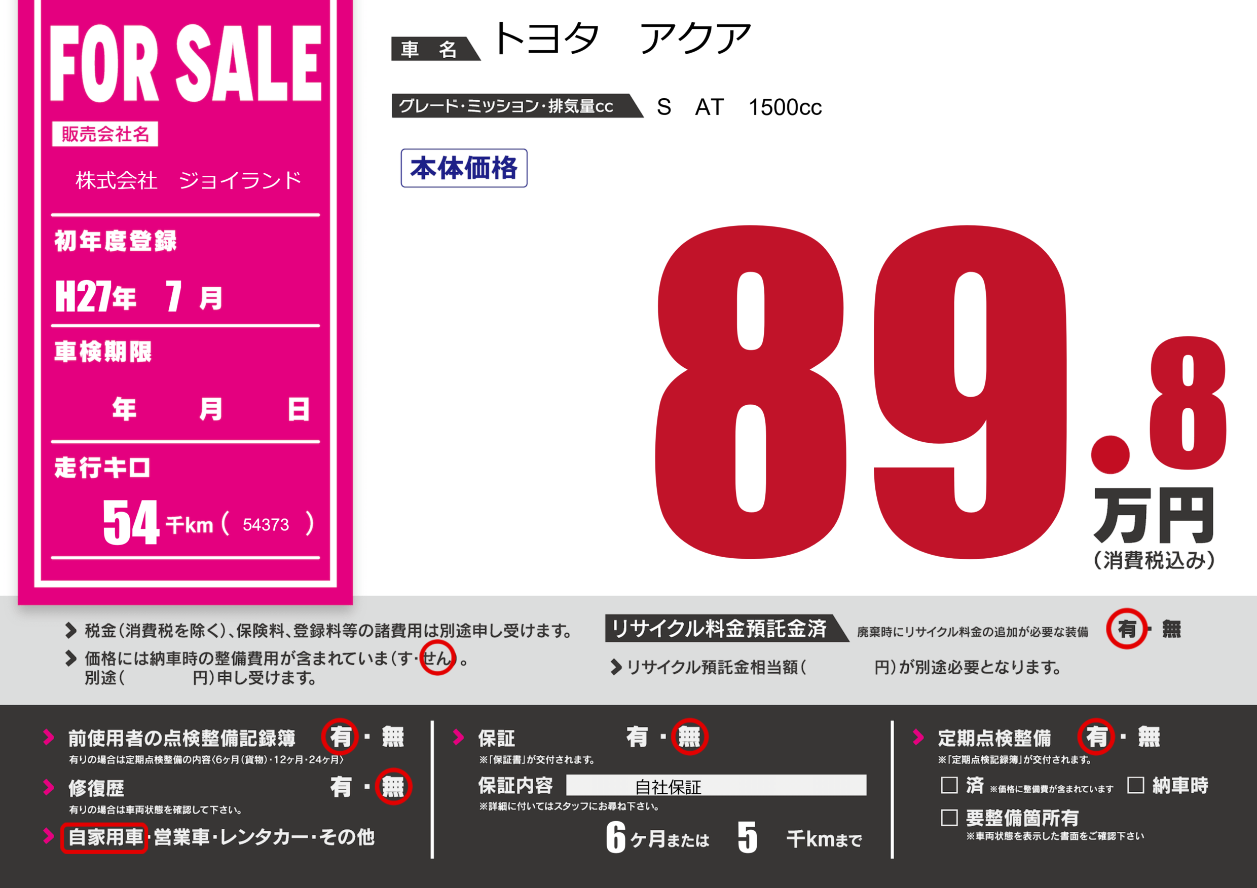 | 車名 | トヨタ アクア | グレード ミッション 排気量 |