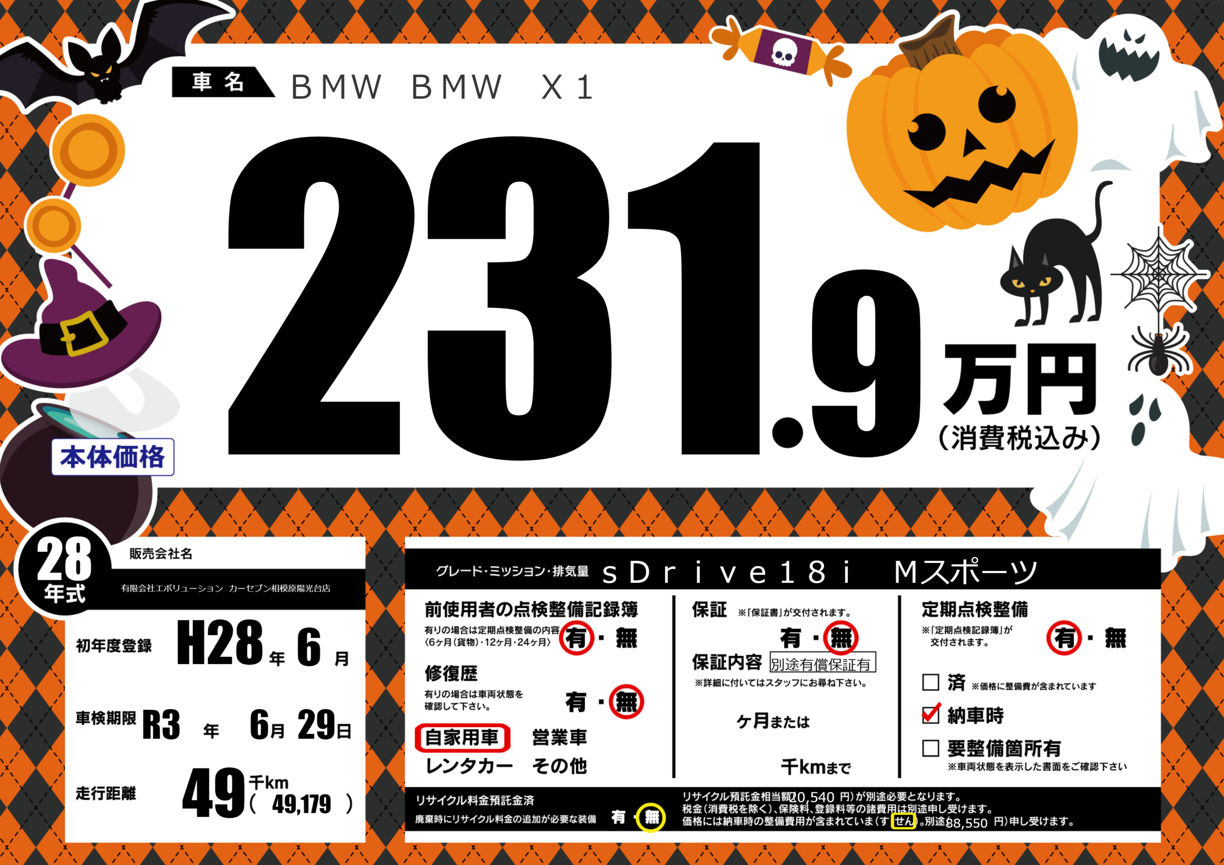 | 車名 | BMW BMW X1 | グレード ミッション 排気量 |