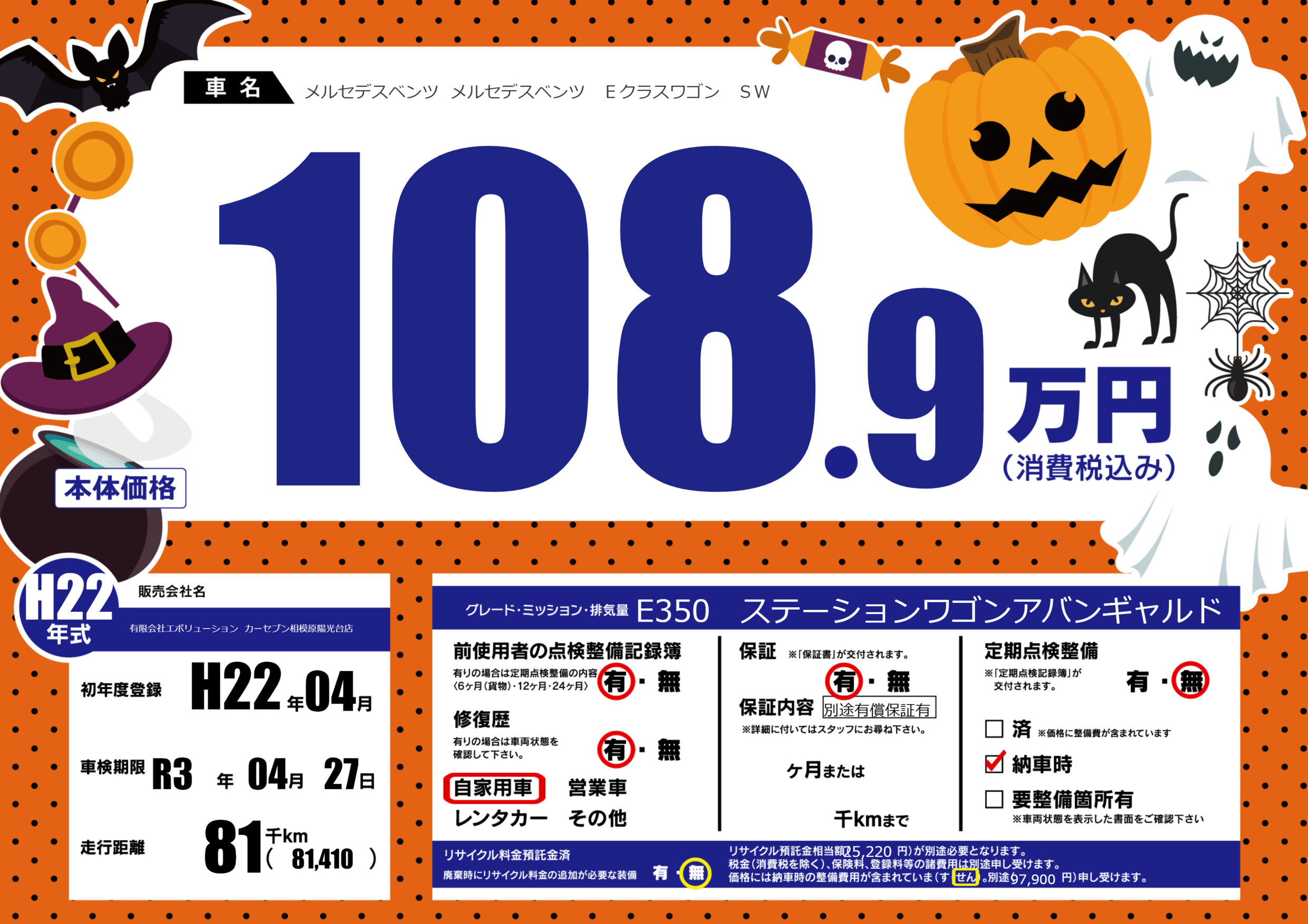 | 車名 | メルセデスベンツ メルセデスベンツ Eクラスワゴン SW | グレード ミッション 排気量 |