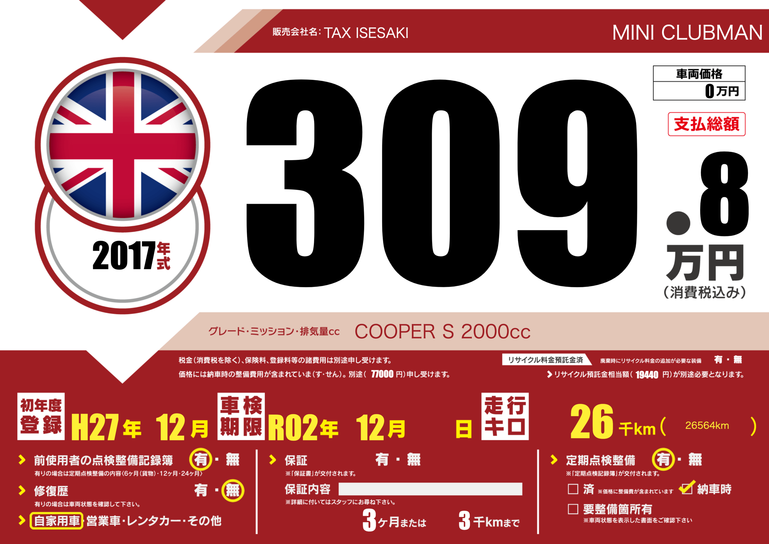 | 車名 | MINI CLUBMAN | グレード ミッション 排気量 |