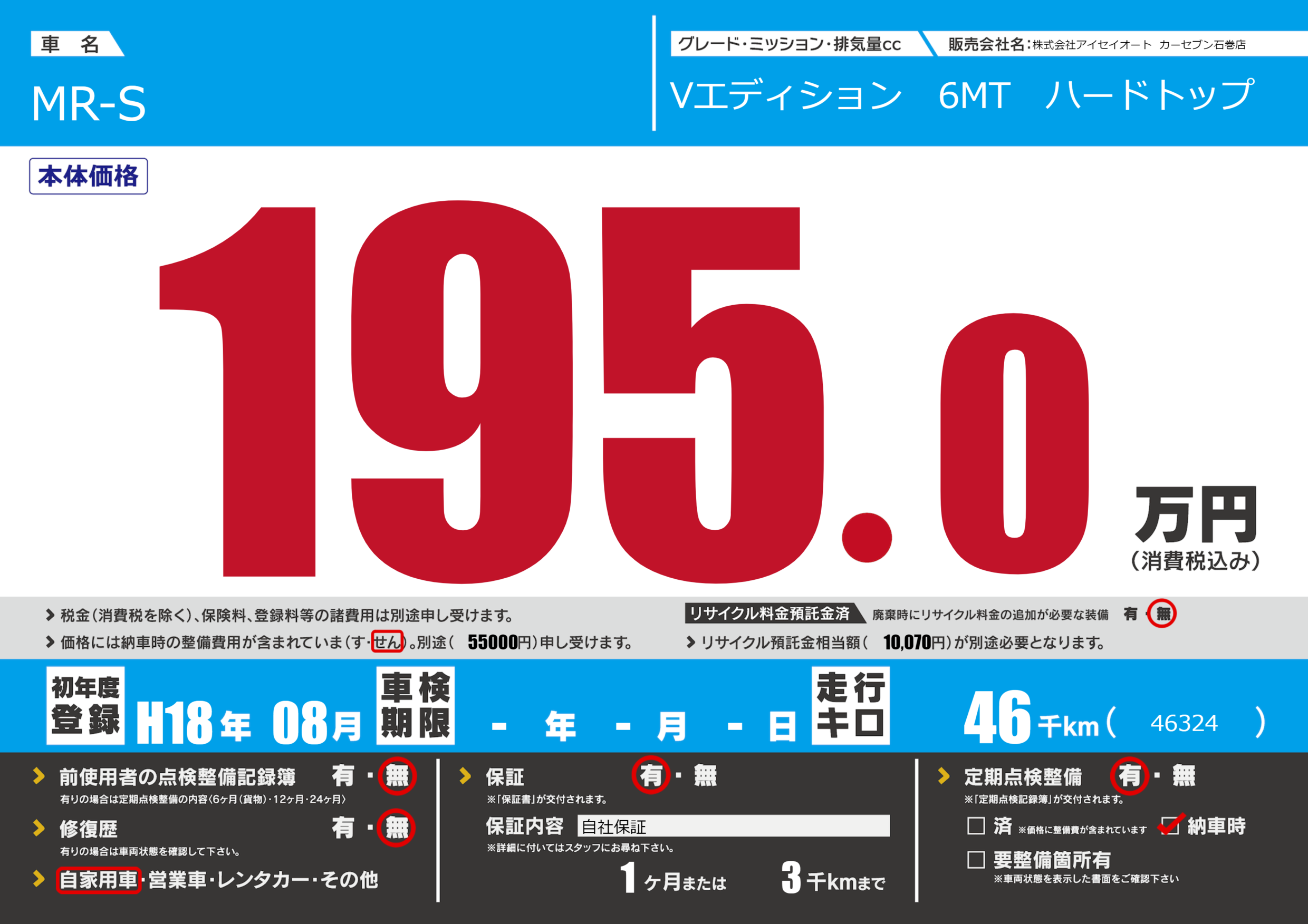 | 走行キロ | 4.6万km | 初年度登録 | H18年08月 |