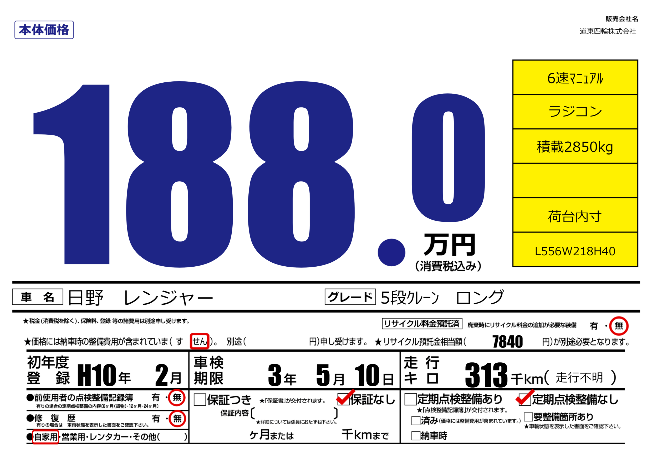 | 車名 | 日野 レンジャー | グレード ミッション 排気量 |