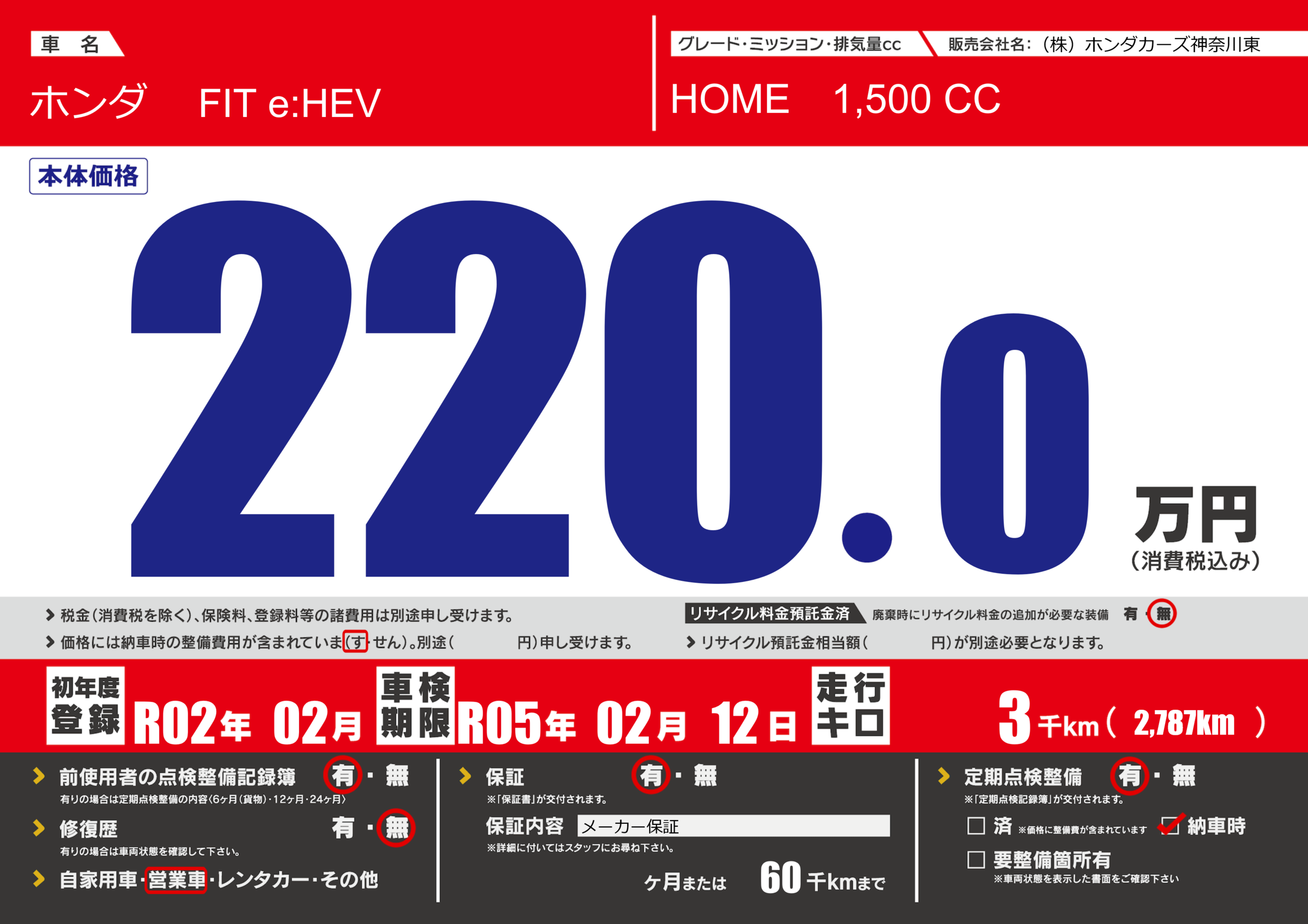 | 車名 | ホンダ FIT e:HEV | グレード ミッション 排気量 |