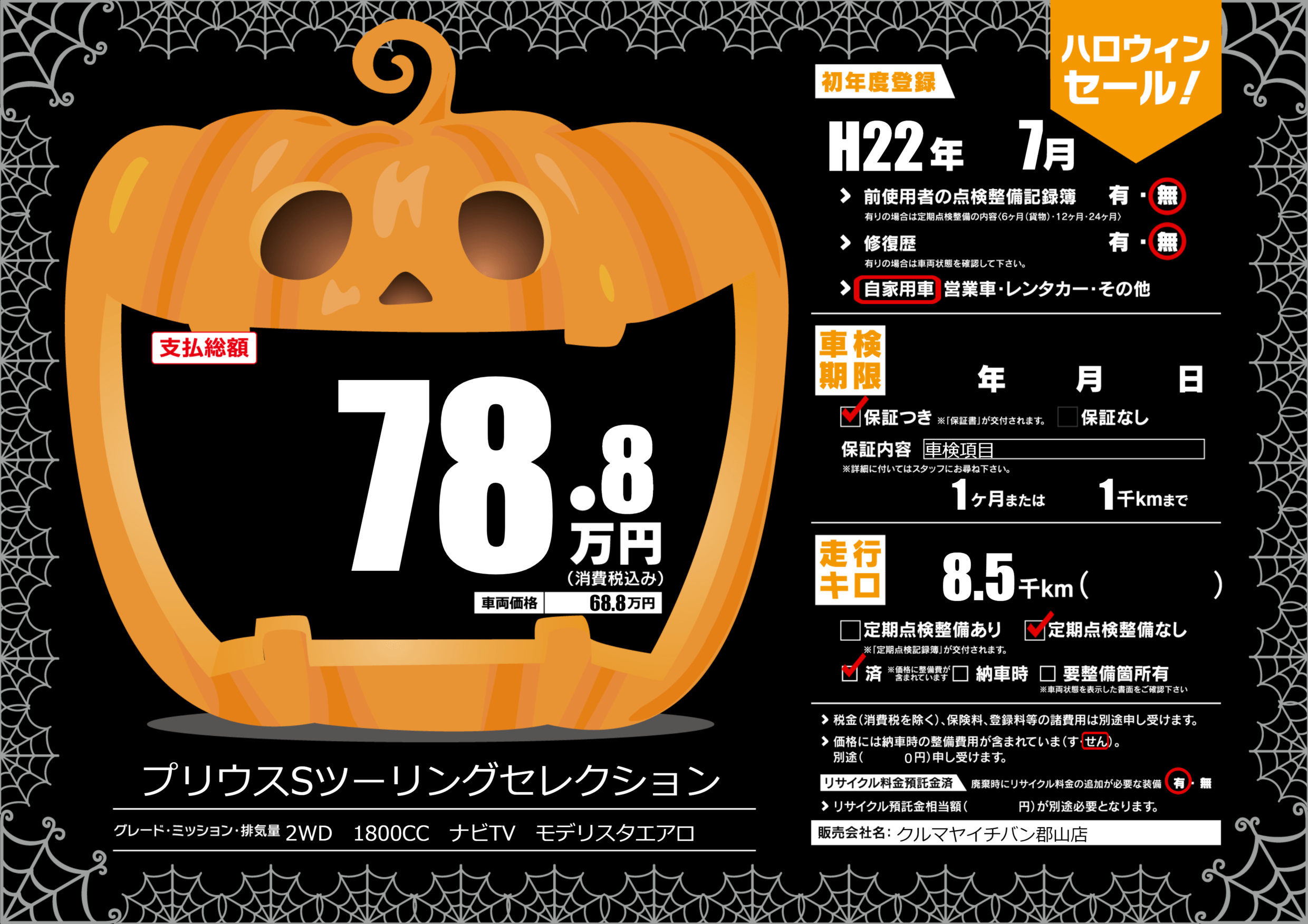 | 走行キロ | 0.8万km | 初年度登録 | H22年7月 |