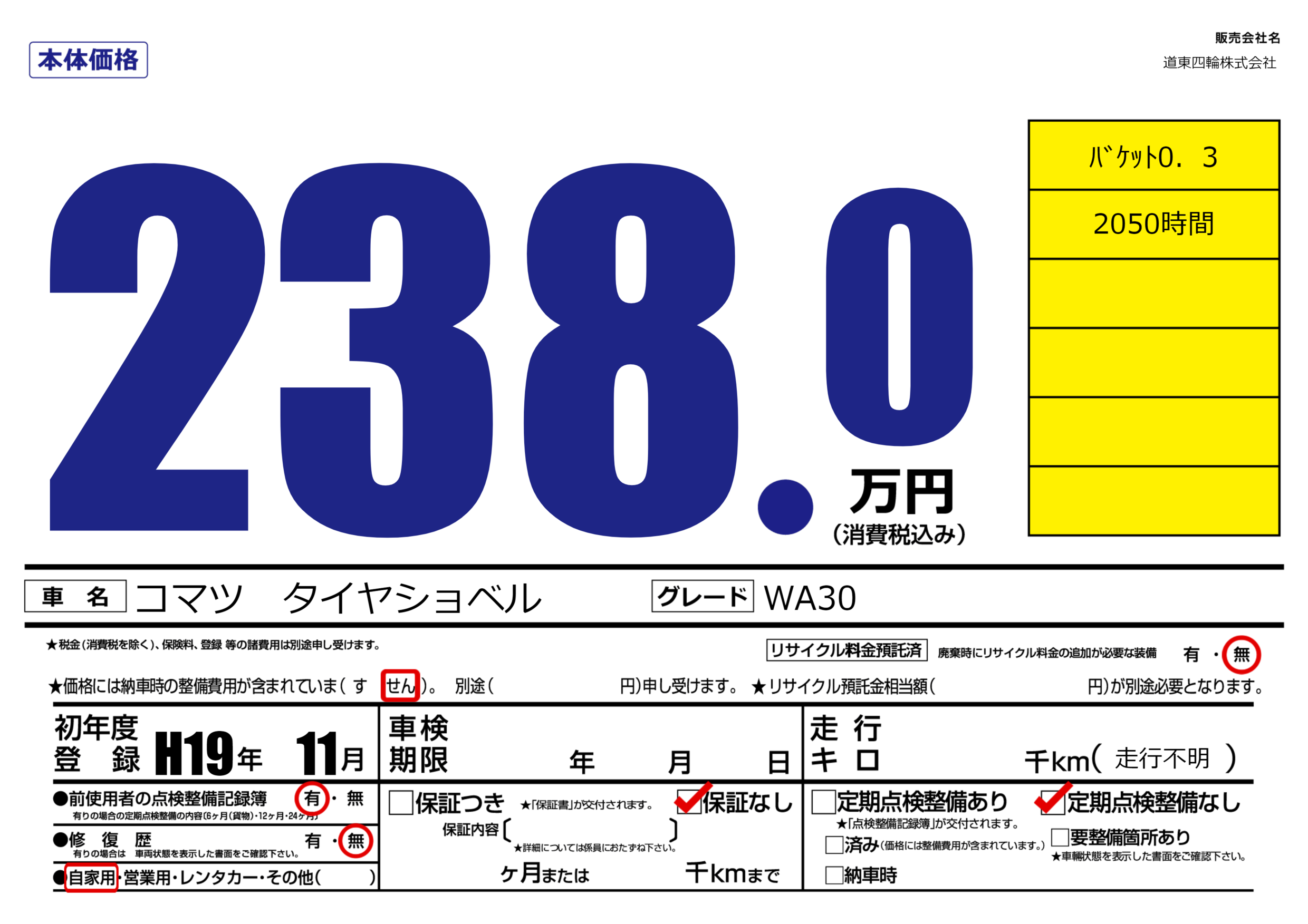 | 車名 | コマツ タイヤショベル | グレード ミッション 排気量 |