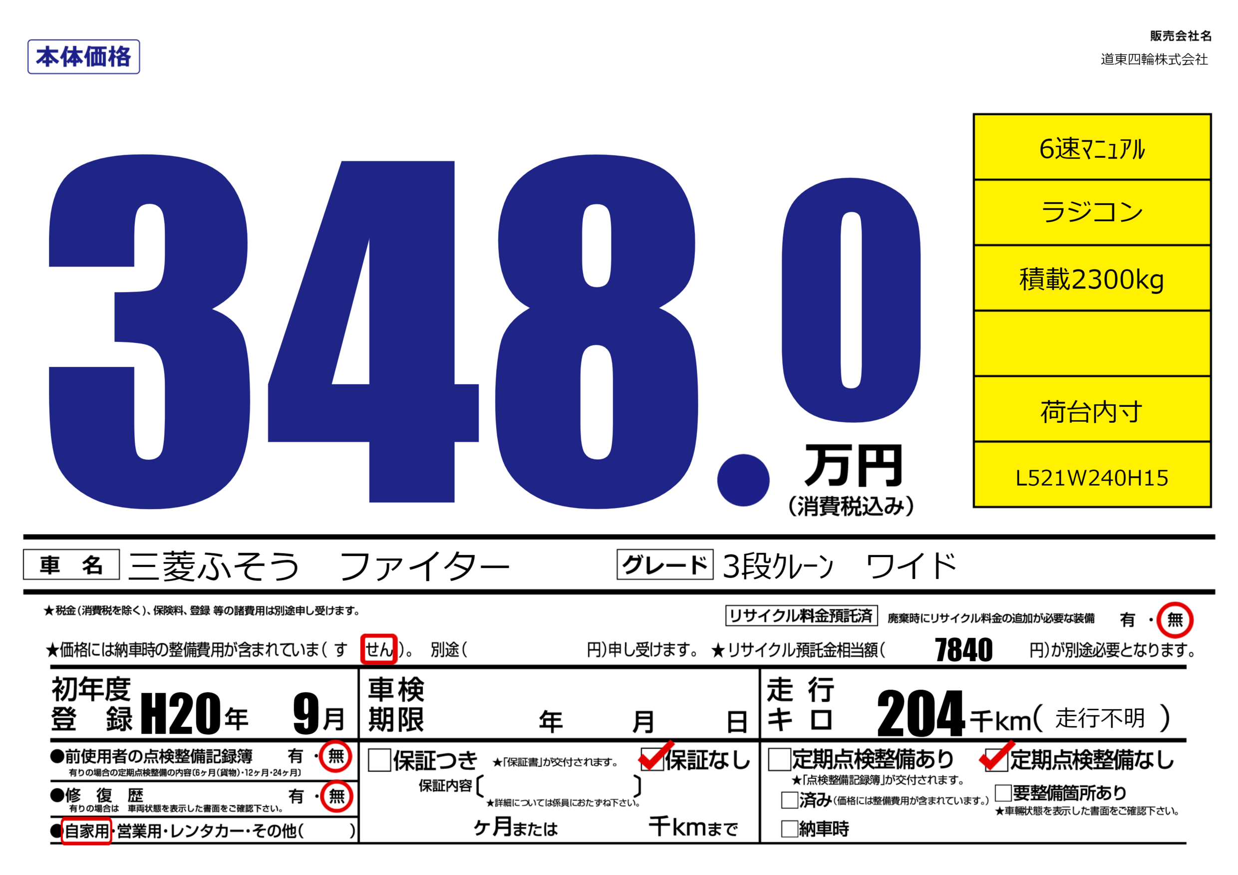 | 車名 | 三菱ふそう ファイター | グレード ミッション 排気量 |