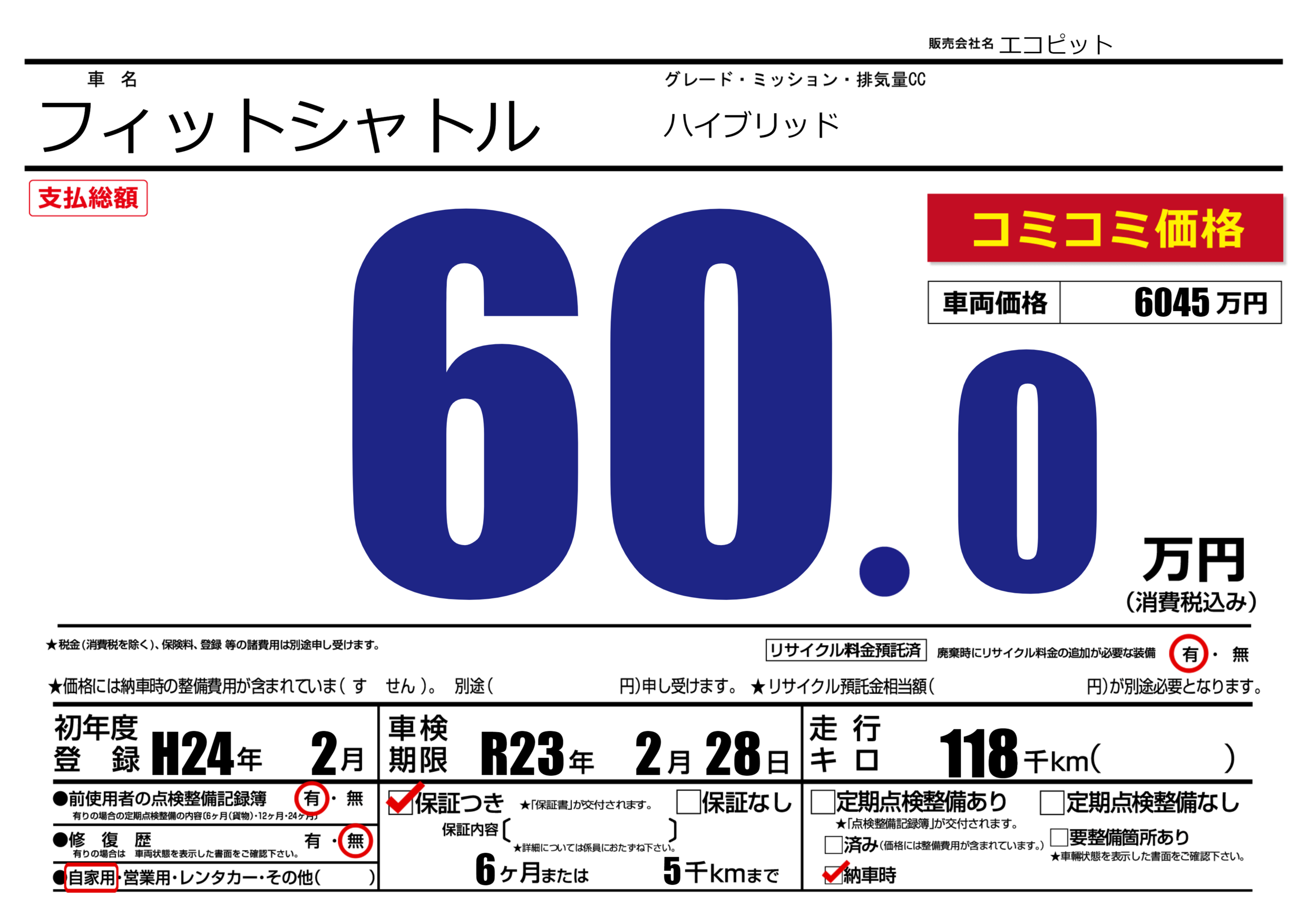 | 車検制限 | R23年 2月 28日 | ||