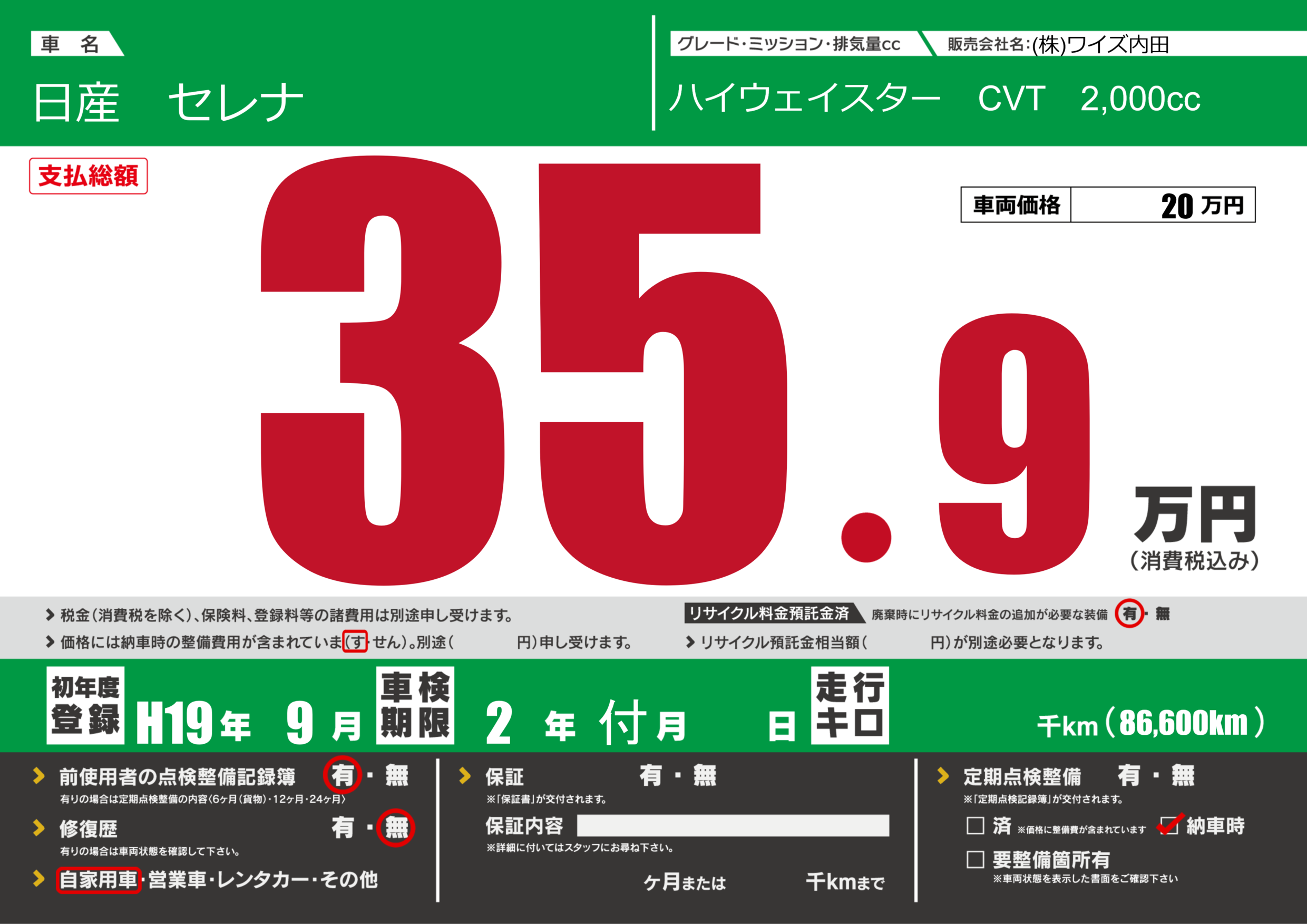 | 走行キロ | - | 初年度登録 | H19年9月 |