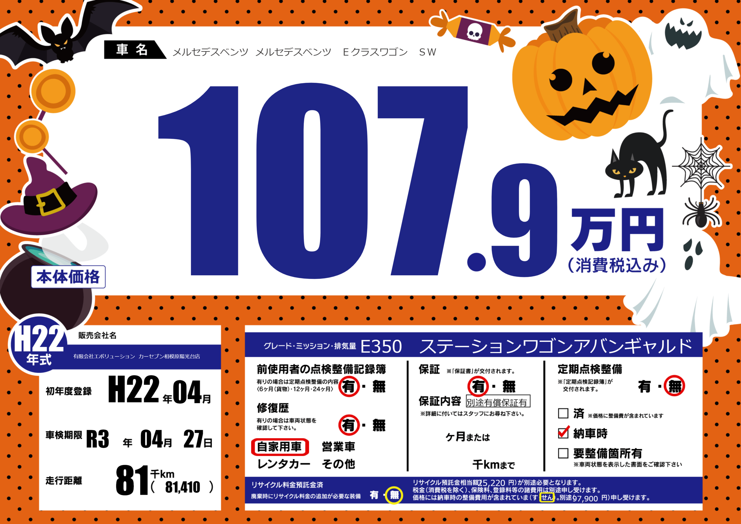 | 車名 | メルセデスベンツ メルセデスベンツ Eクラスワゴン SW | グレード ミッション 排気量 |