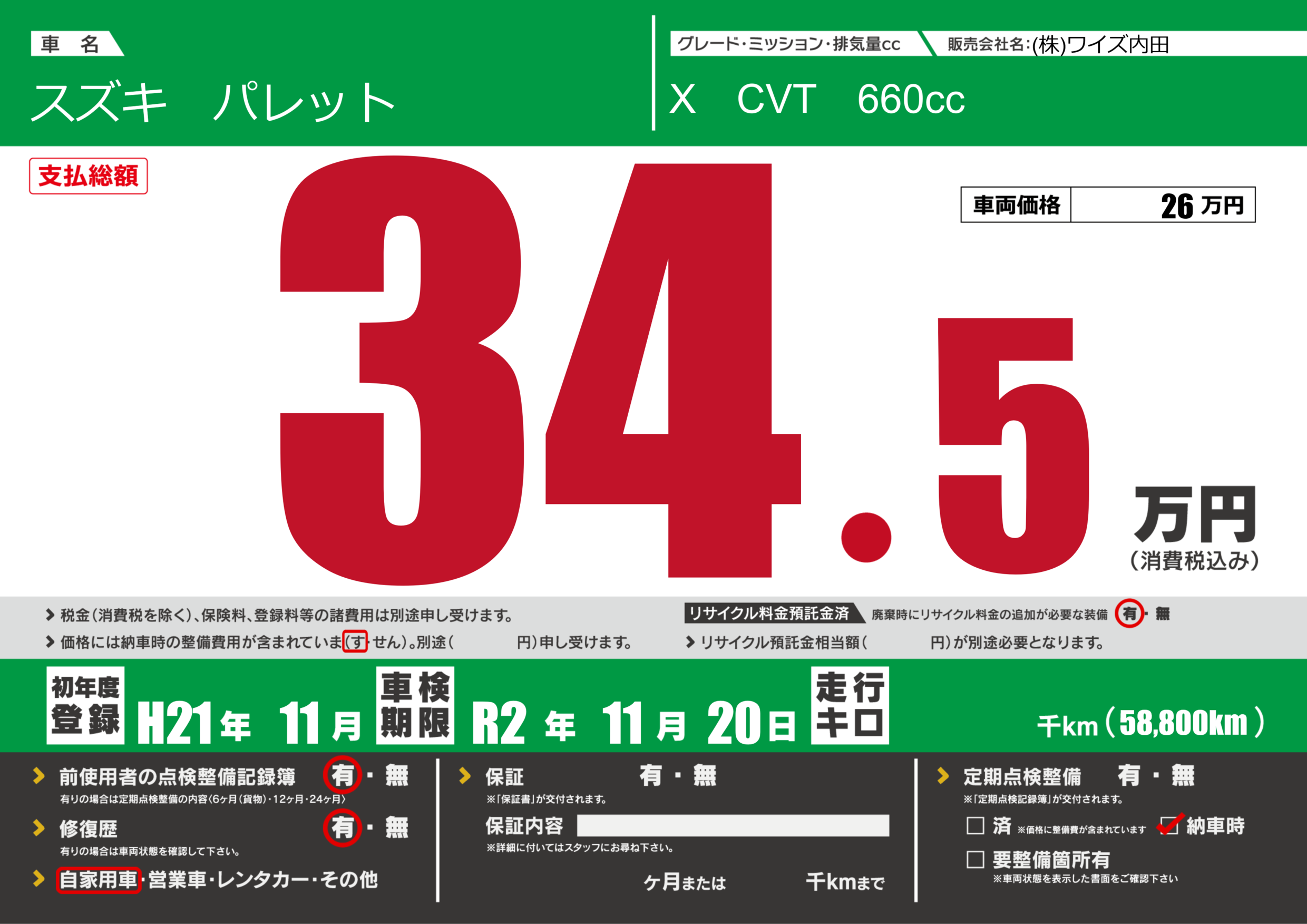 | 車名 | スズキ パレット | グレード ミッション 排気量 |