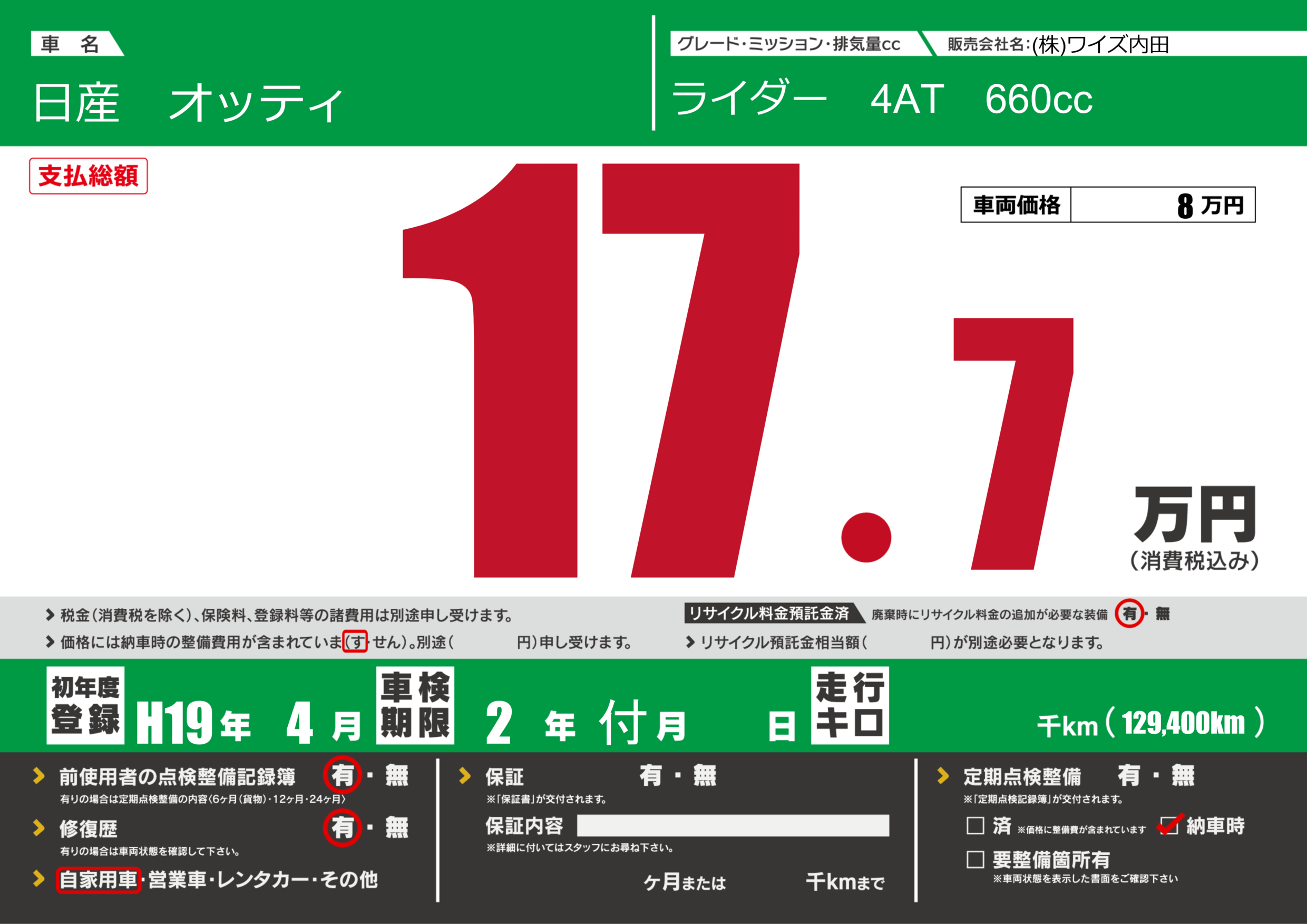 | 車名 | 日産 オッティ | グレード ミッション 排気量 |