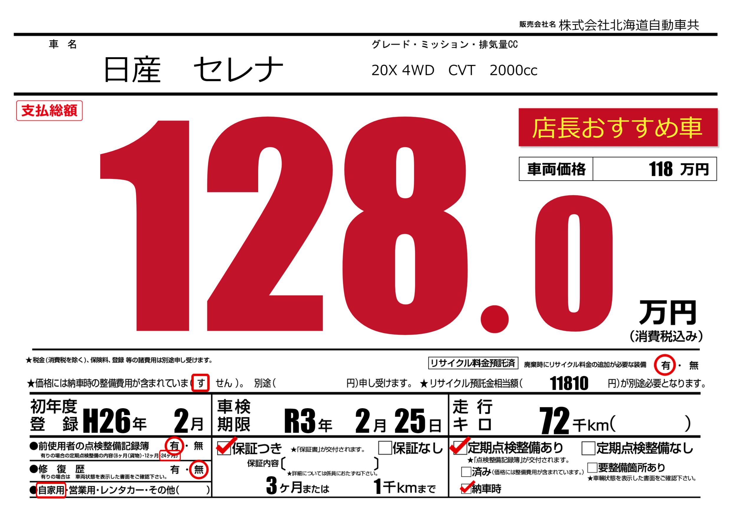 | 車名 | 日産 セレナ | グレード ミッション 排気量 |