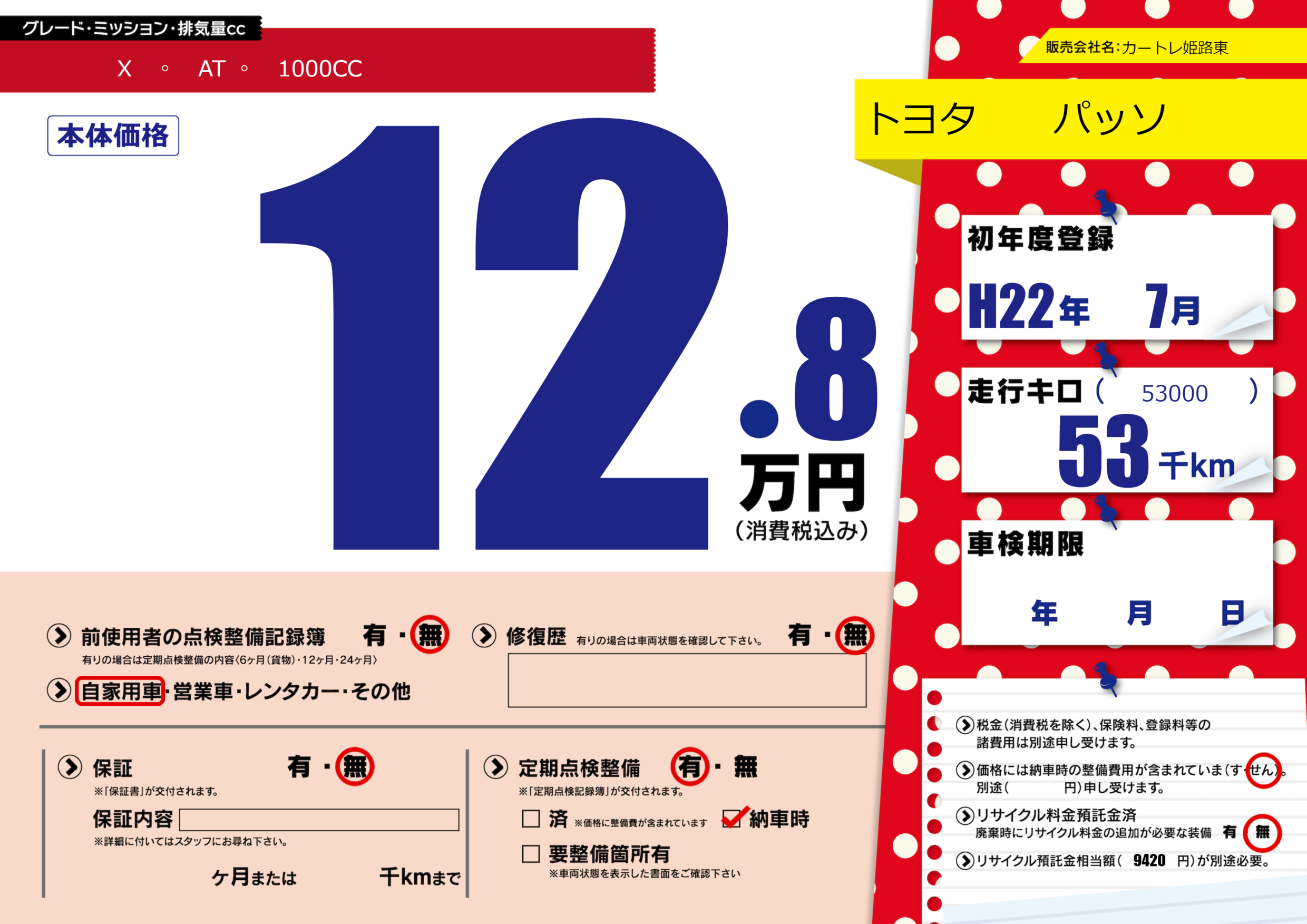 | 車名 | トヨタ パッソ | グレード ミッション 排気量 |