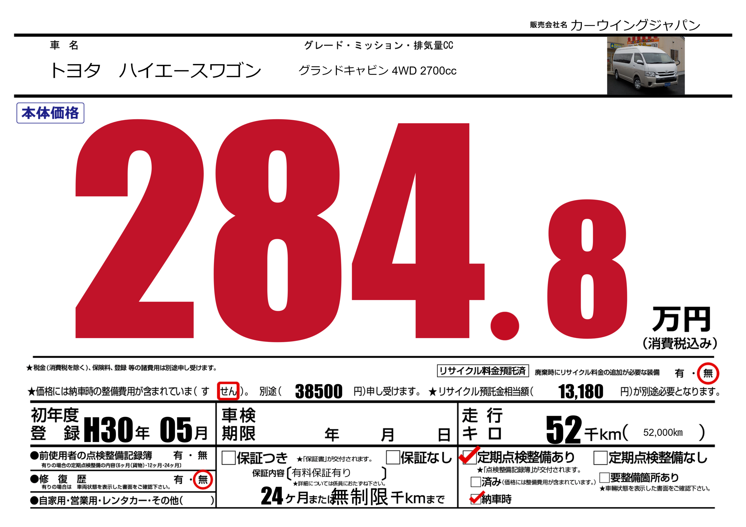 | 車名 | トヨタ ハイエースワゴン | グレード ミッション 排気量 |