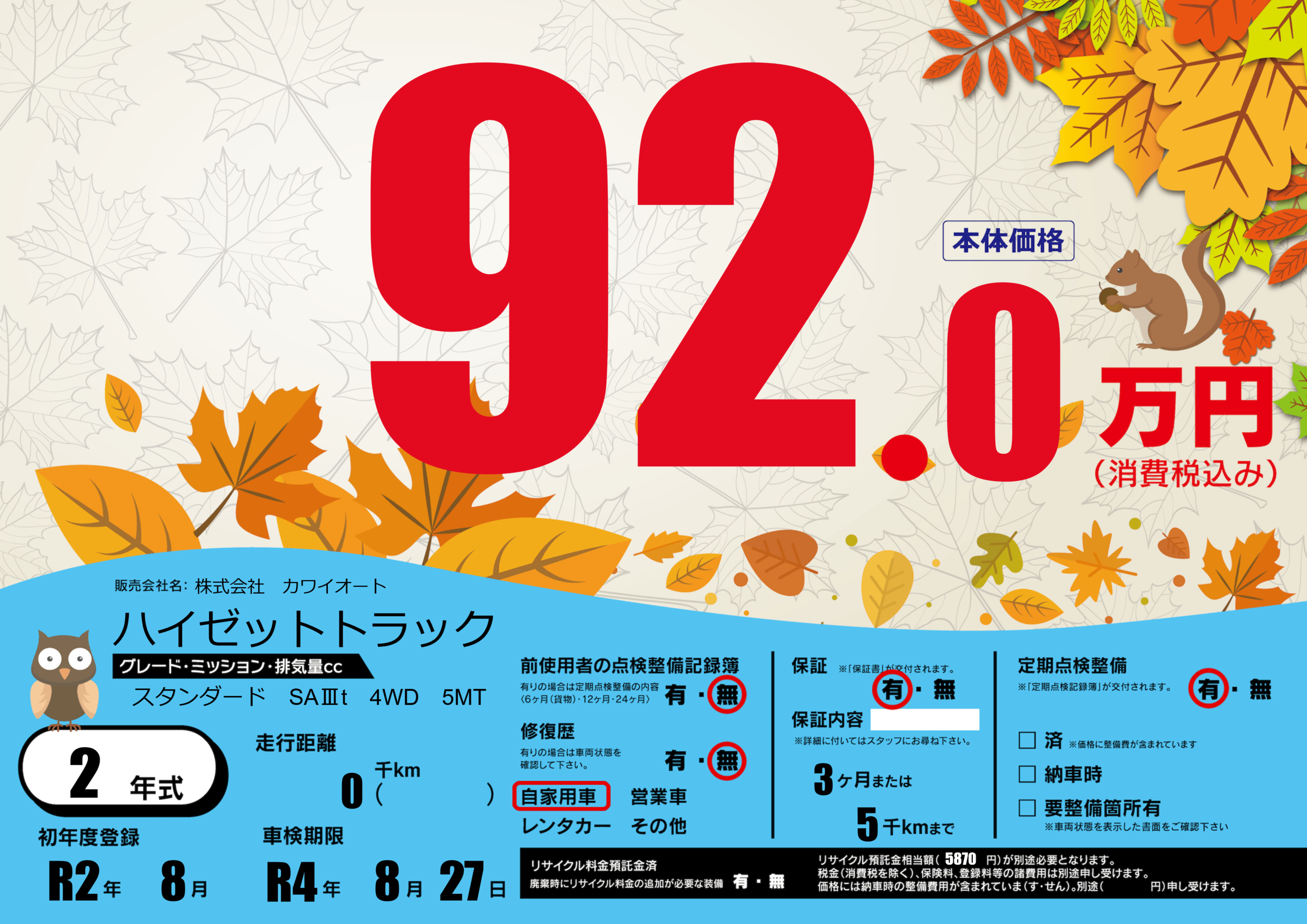 | 車名 | ハイゼットトラック | グレード ミッション 排気量 |