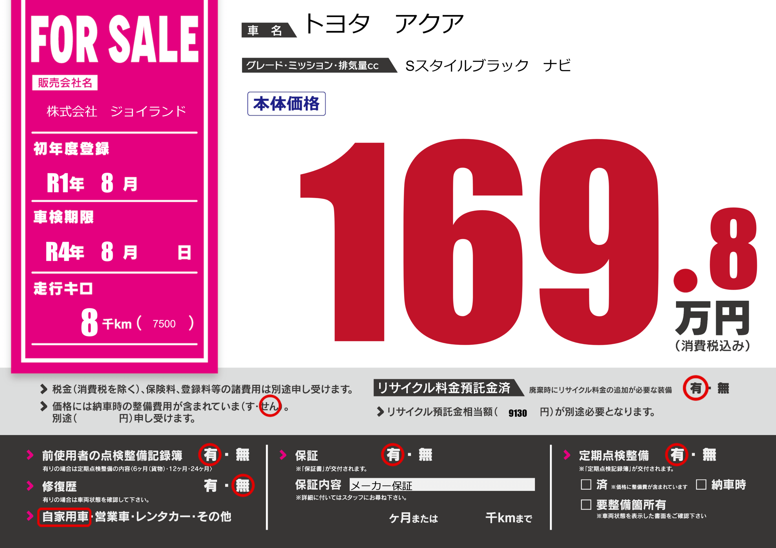| 車名 | トヨタ アクア | グレード ミッション 排気量 |