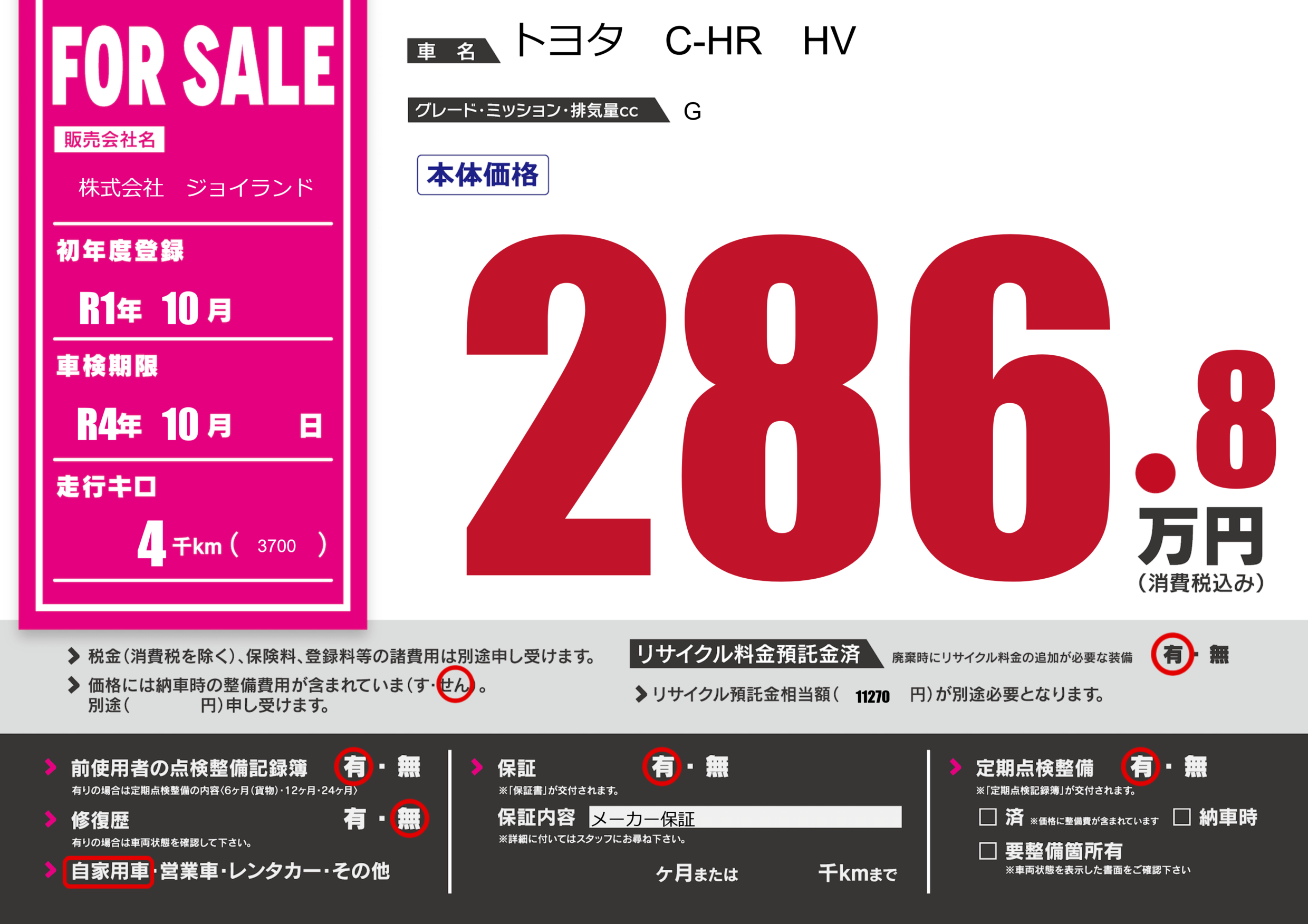 | 車名 | トヨタ C-HR HV | グレード ミッション 排気量 |