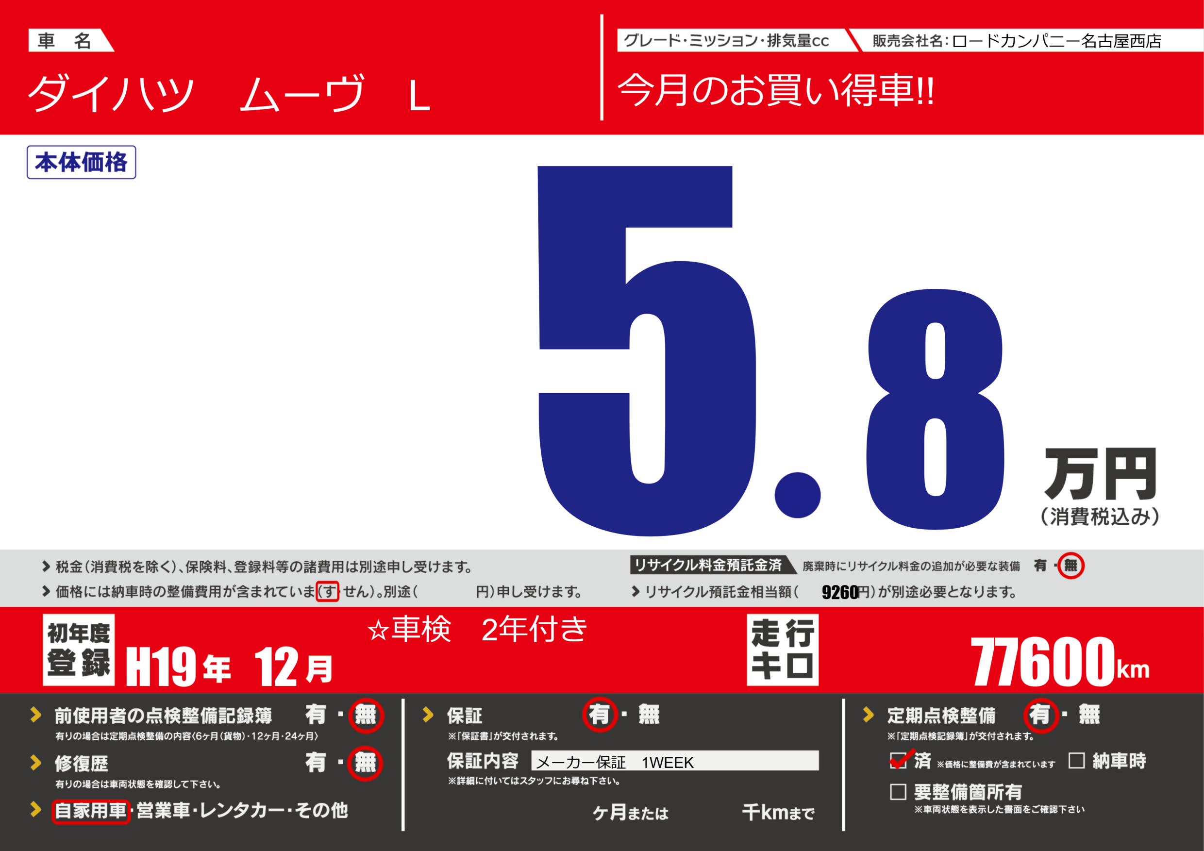 | 定期点検整備 | 定期点検整備あり 定期点検整備済み | ||