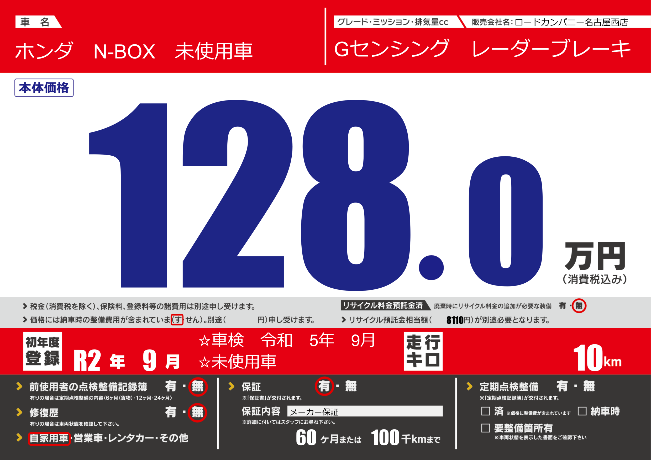 | 車名 | ホンダ N-BOX 未使用車 | グレード ミッション 排気量 |