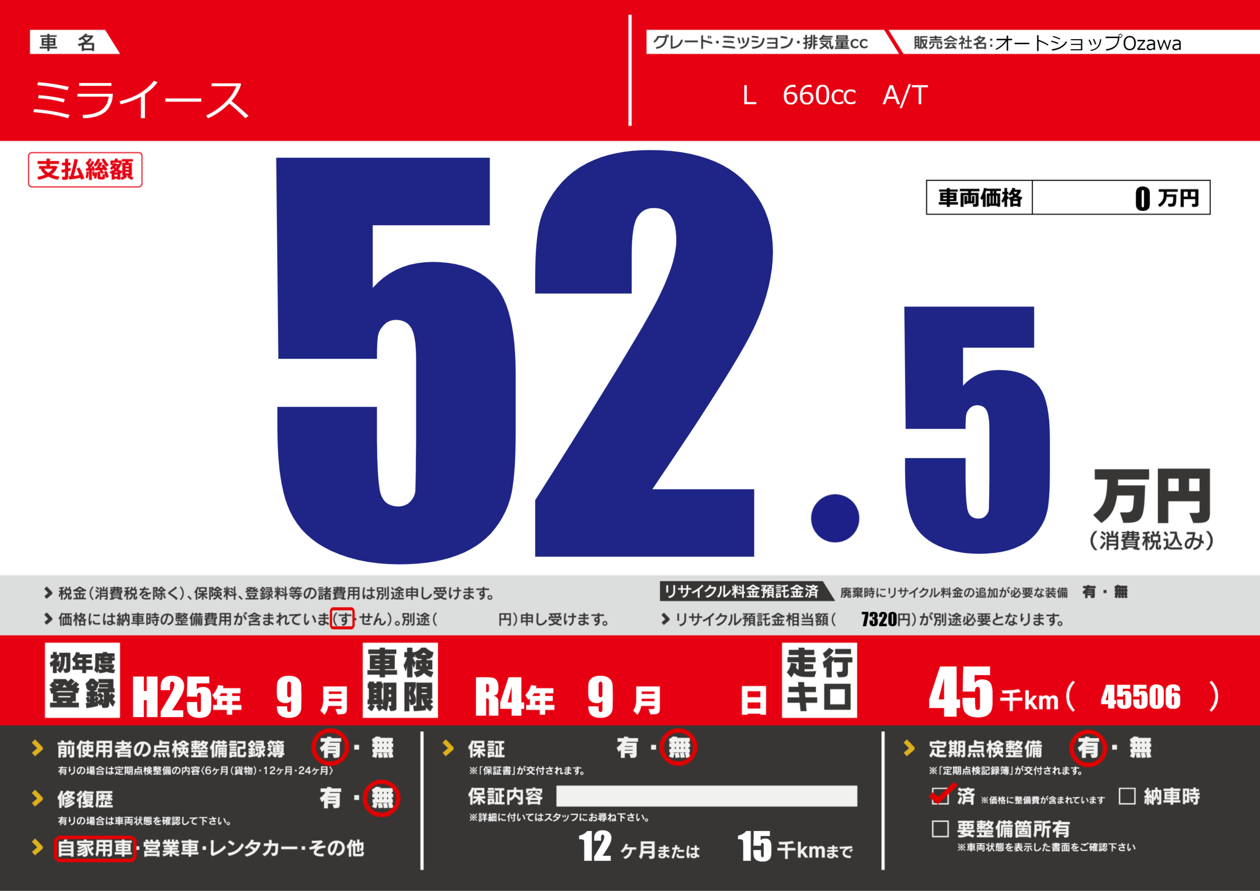 | 定期点検整備 | 定期点検整備あり 定期点検整備済み | ||
