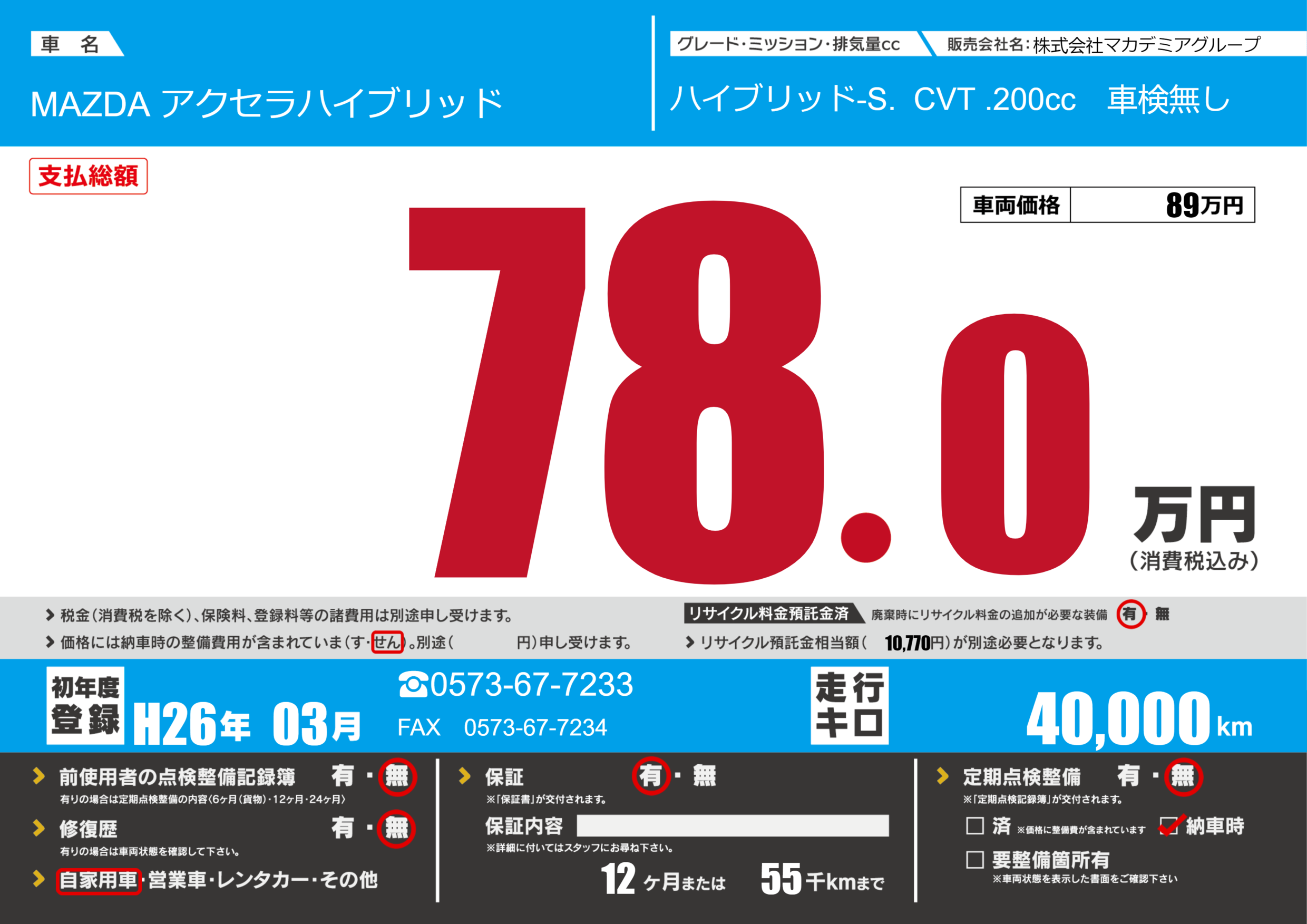 | 車名 | MAZDA アクセラハイブリッド | グレード ミッション 排気量 |