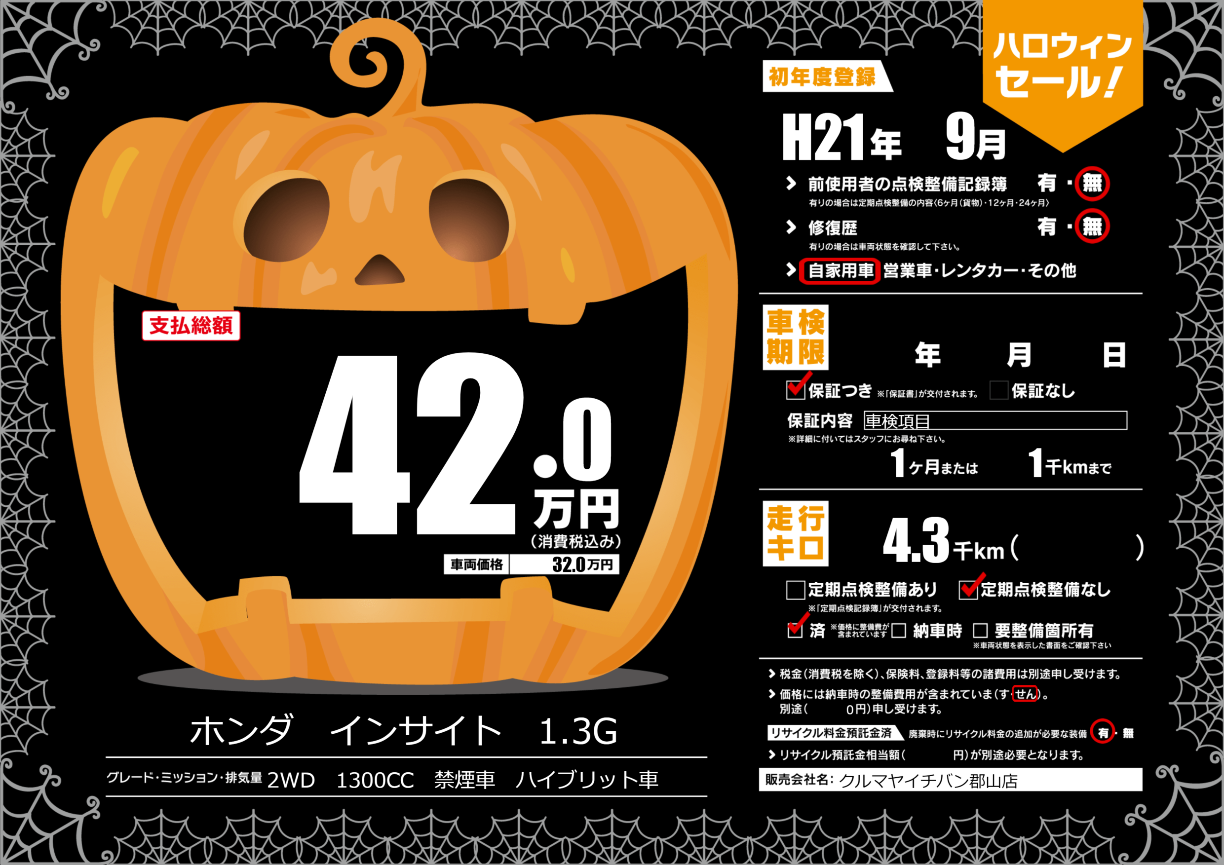 | 走行キロ | 0.4万km | 初年度登録 | H21年9月 |