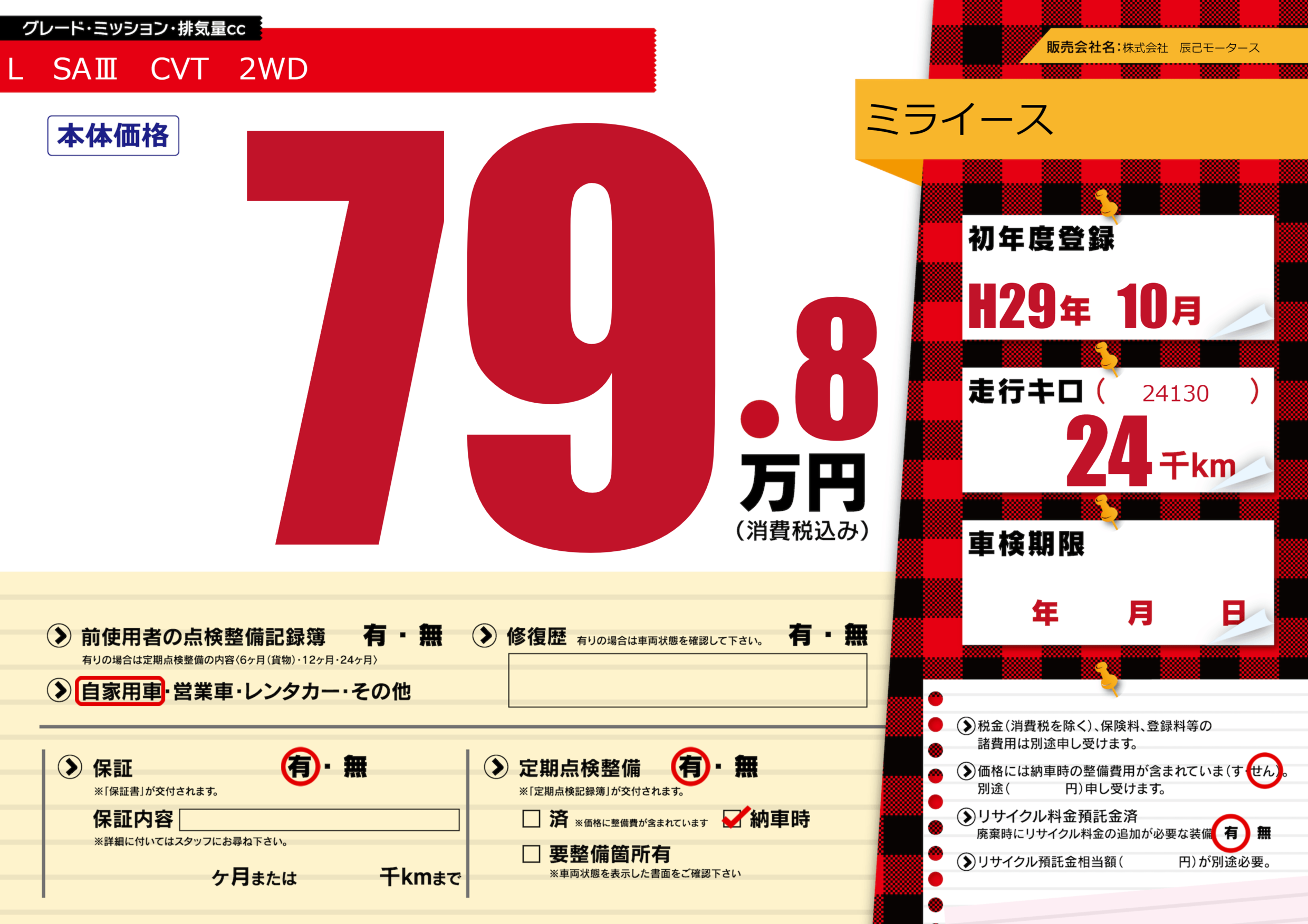 | 定期点検整備 | 定期点検整備あり 納車時あり | ||