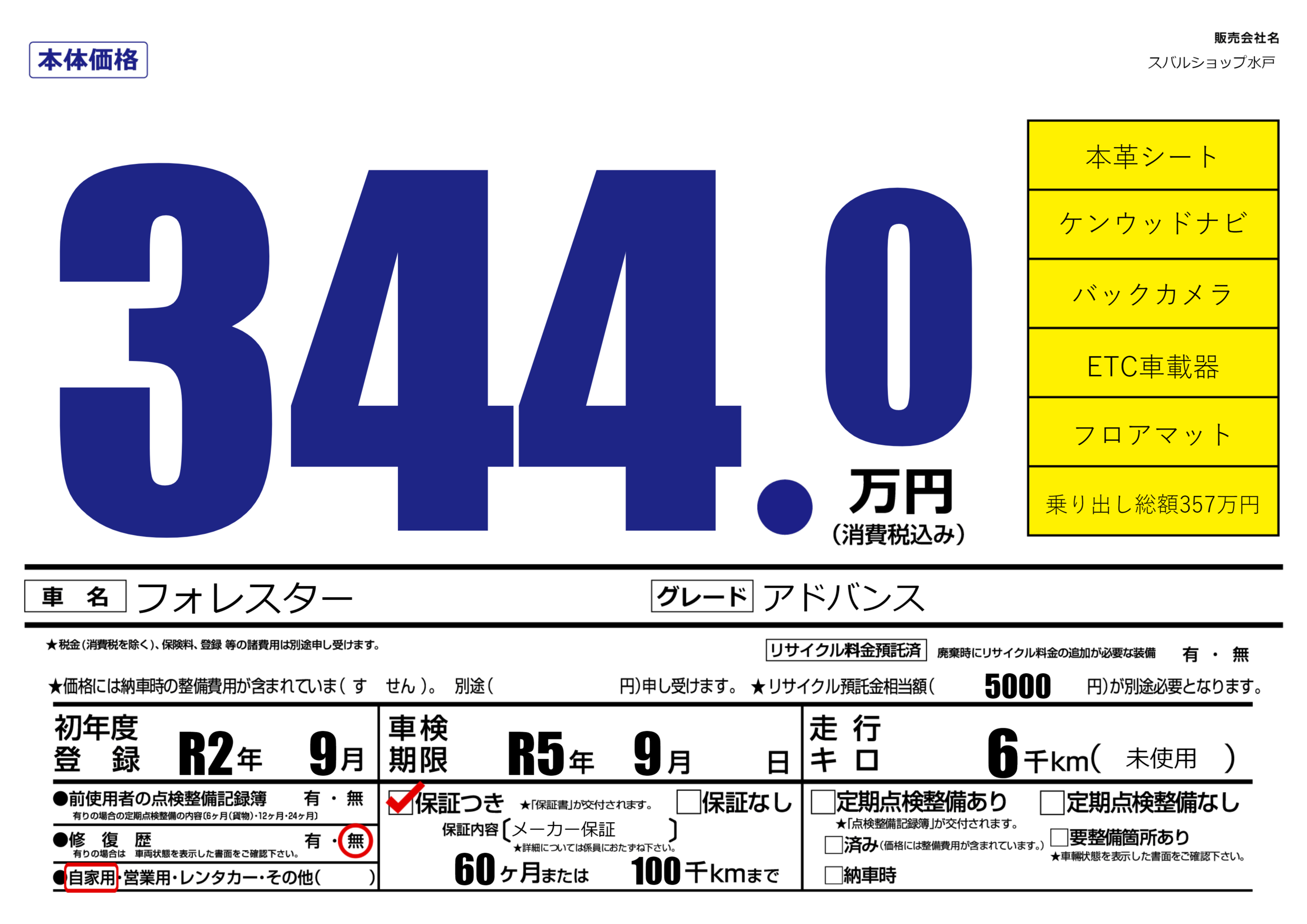 | 車名 | フォレスター | グレード ミッション 排気量 |