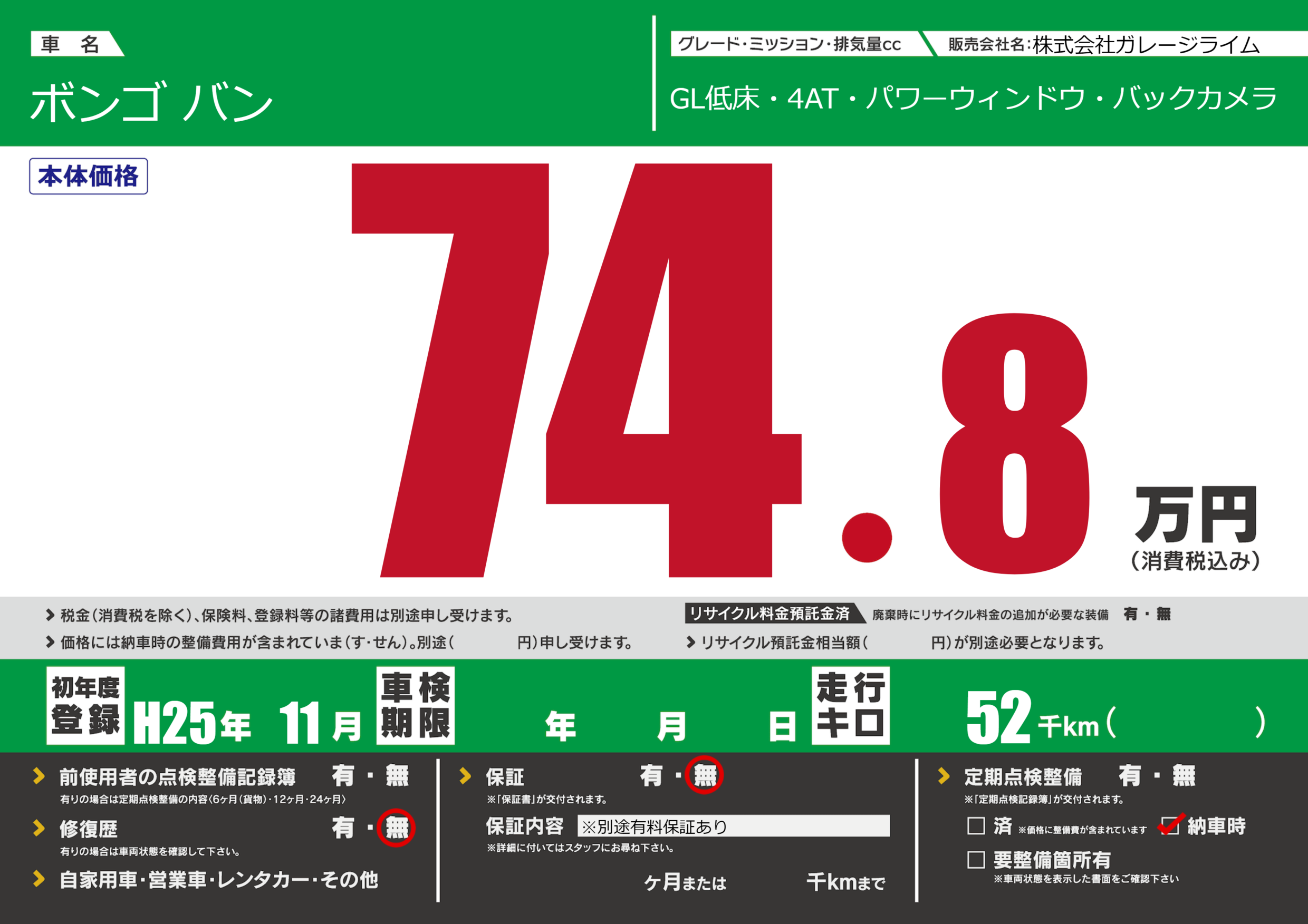 | 車名 | ボンゴ バン | グレード ミッション 排気量 |