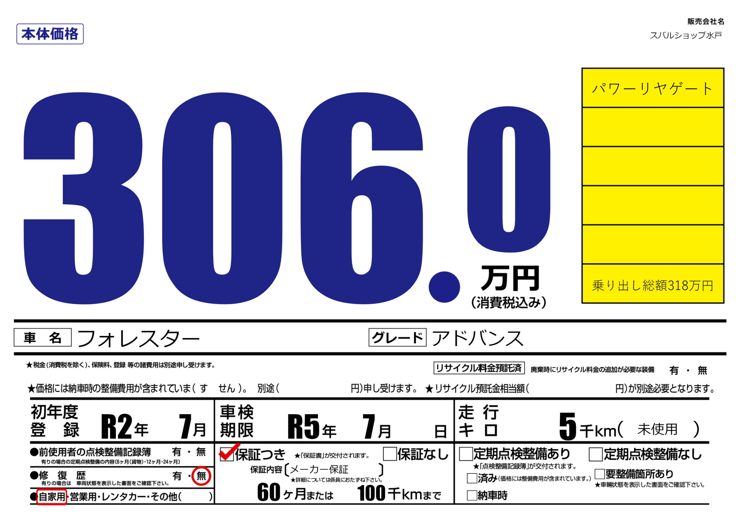 | 車名 | フォレスター | グレード ミッション 排気量 |