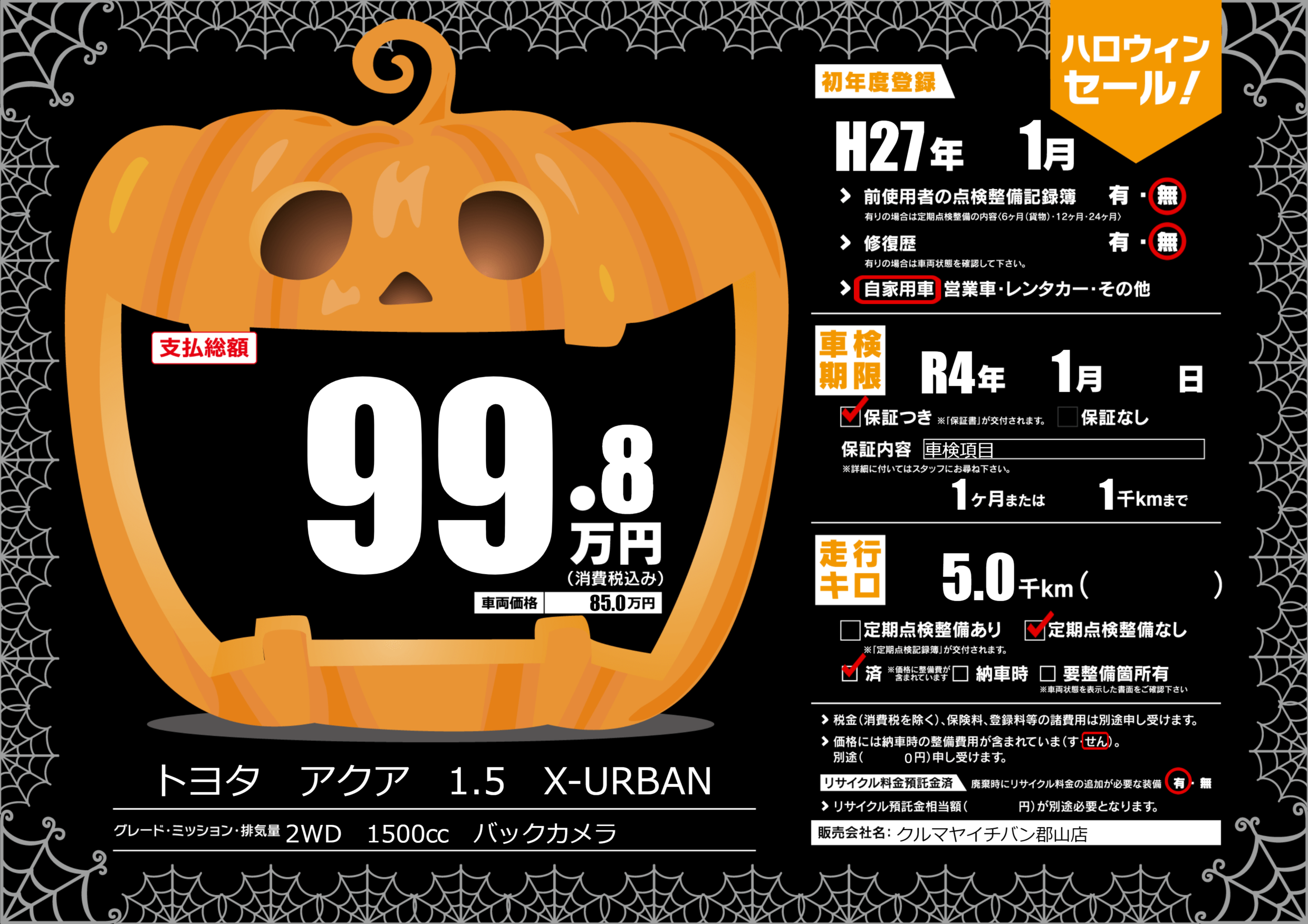| 車名 | トヨタ アクア 1.5 X-URBAN | グレード ミッション 排気量 |