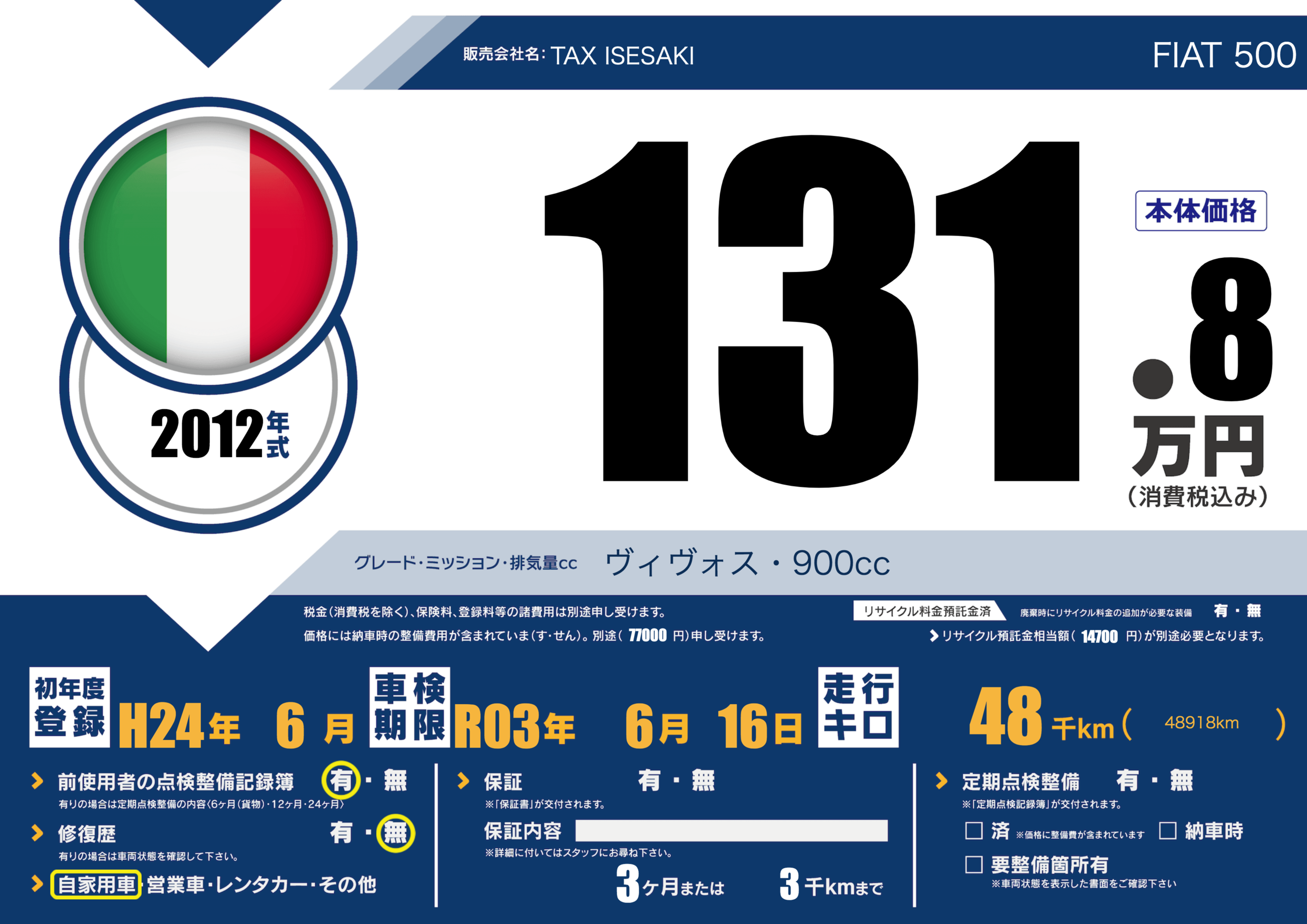 | 車名 | FIAT 500 | グレード ミッション 排気量 |