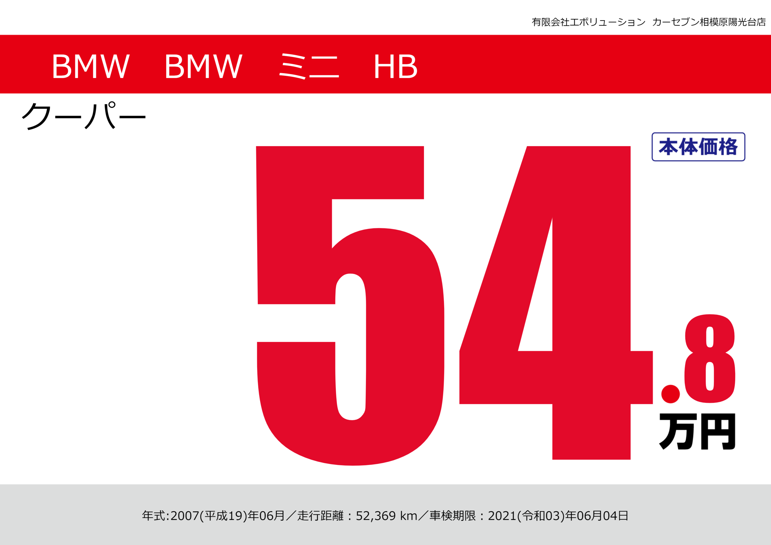 | 車名 | BMW BMW ミニ HB | グレード ミッション 排気量 |