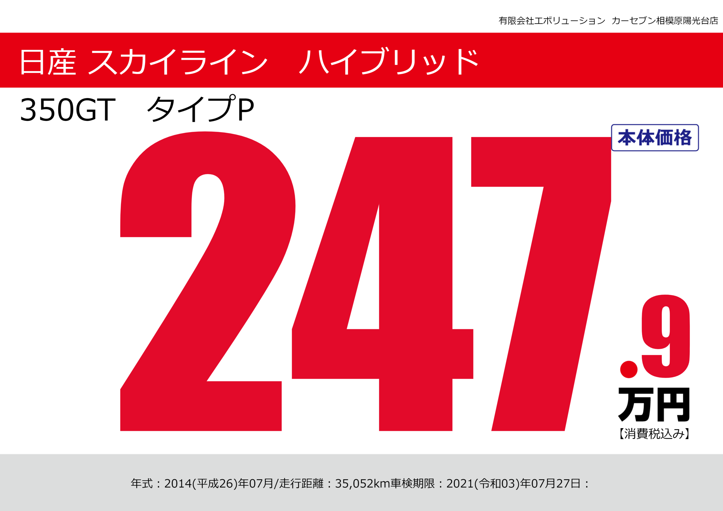 | 車名 | 日産 スカイライン ハイブリッド | グレード ミッション 排気量 |