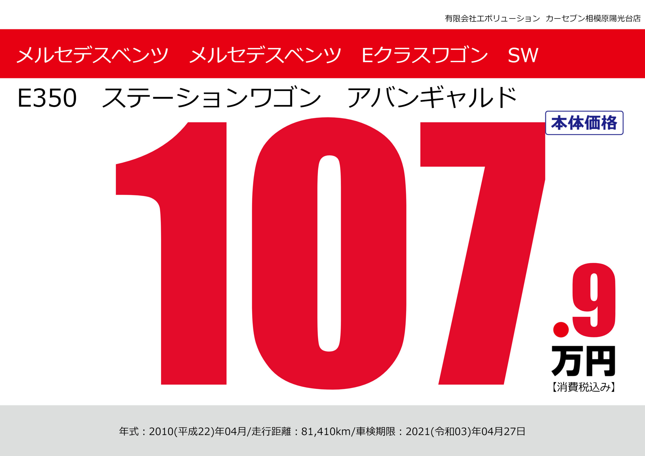| 車名 | メルセデスベンツ メルセデスベンツ Eクラスワゴン SW | グレード ミッション 排気量 |