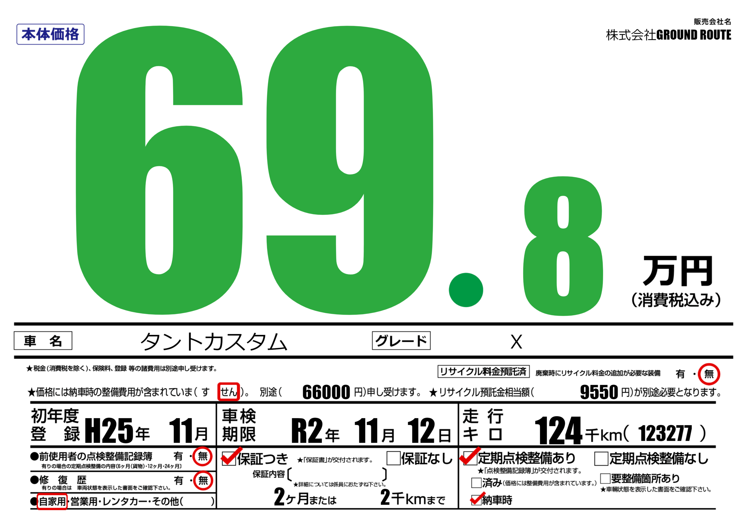 | 車名 | タントカスタム | グレード ミッション 排気量 |