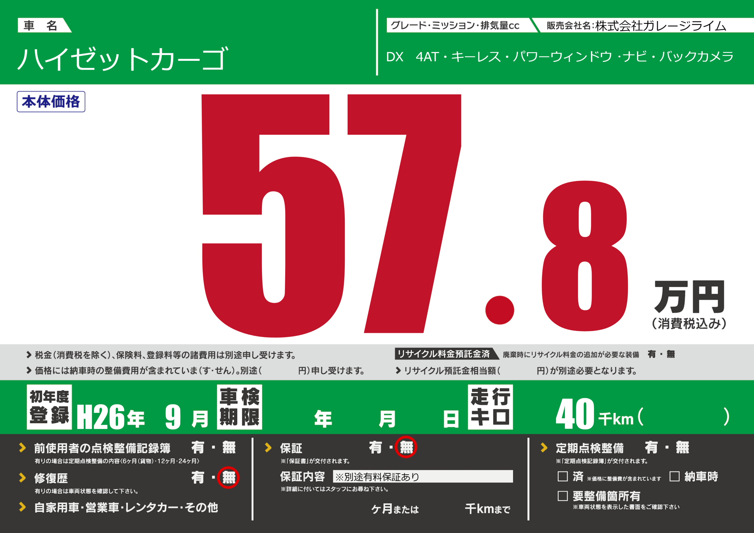 | 車名 | ハイゼットカーゴ | グレード ミッション 排気量 |