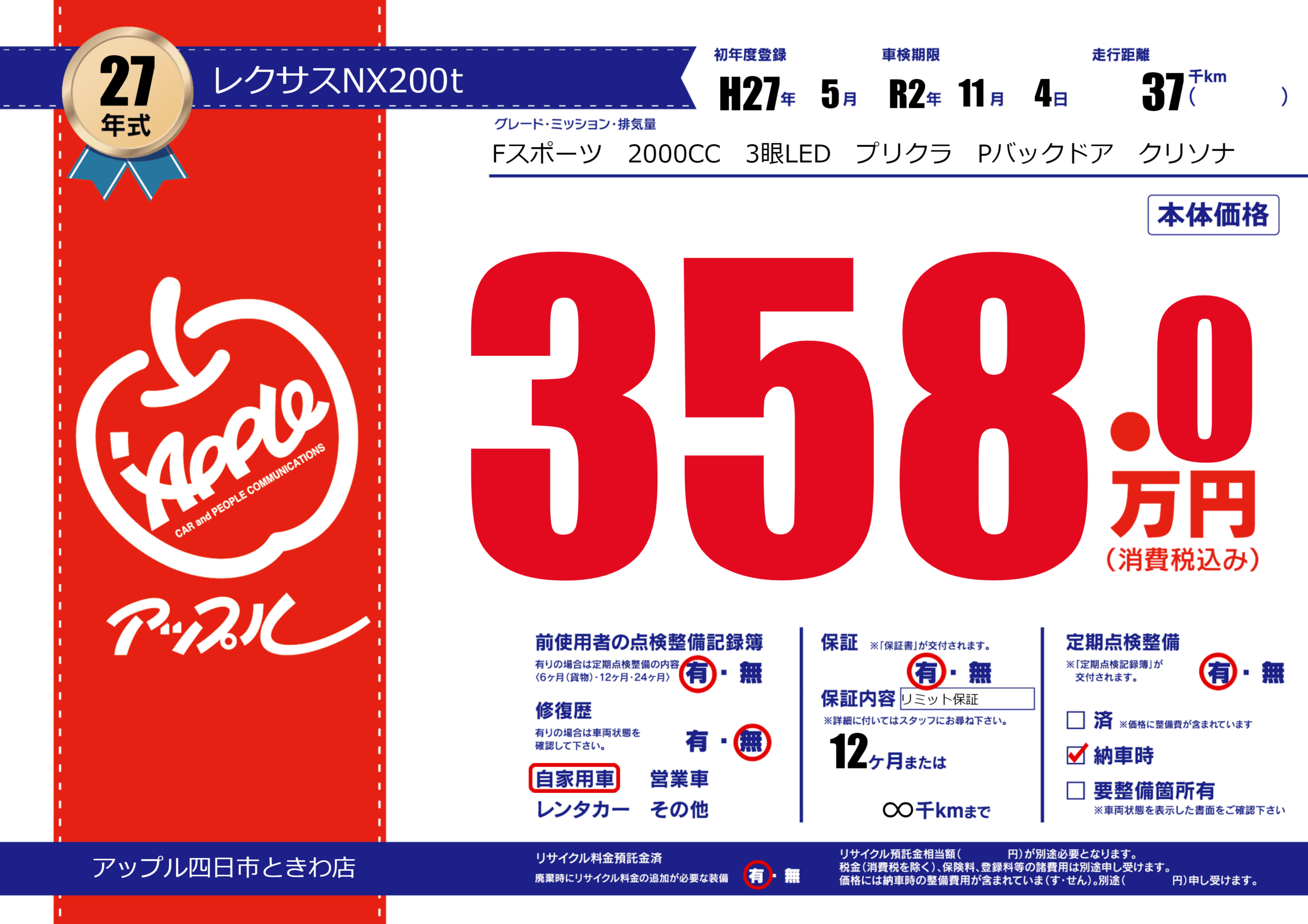| 車名 | レクサスNX200t | グレード ミッション 排気量 |